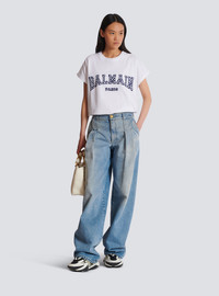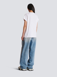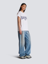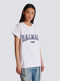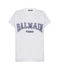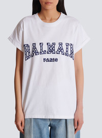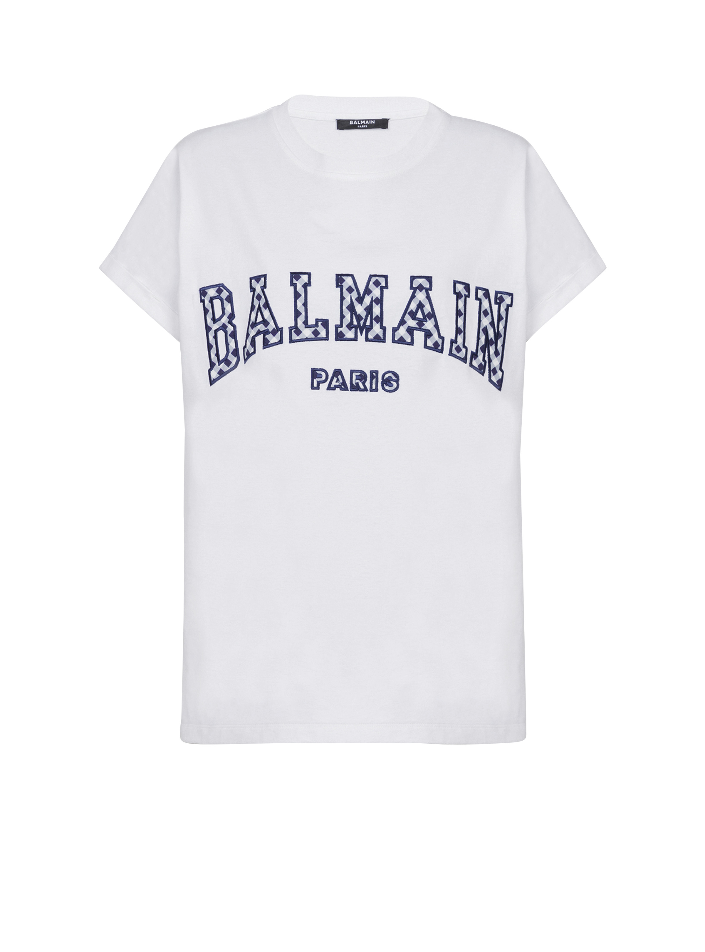 T-shirt with gingham Balmain Paris lettering - Relaxed fit - Round neck with ribbed trim - Short cuffed sleeves - Contrasting embroidered Balmain Paris lettering in a gingham print on the front - Model measures 179cm and wears a size S - Main material: 100% cotton - Made in Bulgaria - Item: DF0EF010BC83100% of the cotton fibres used to make this garment are certified and organically farmed