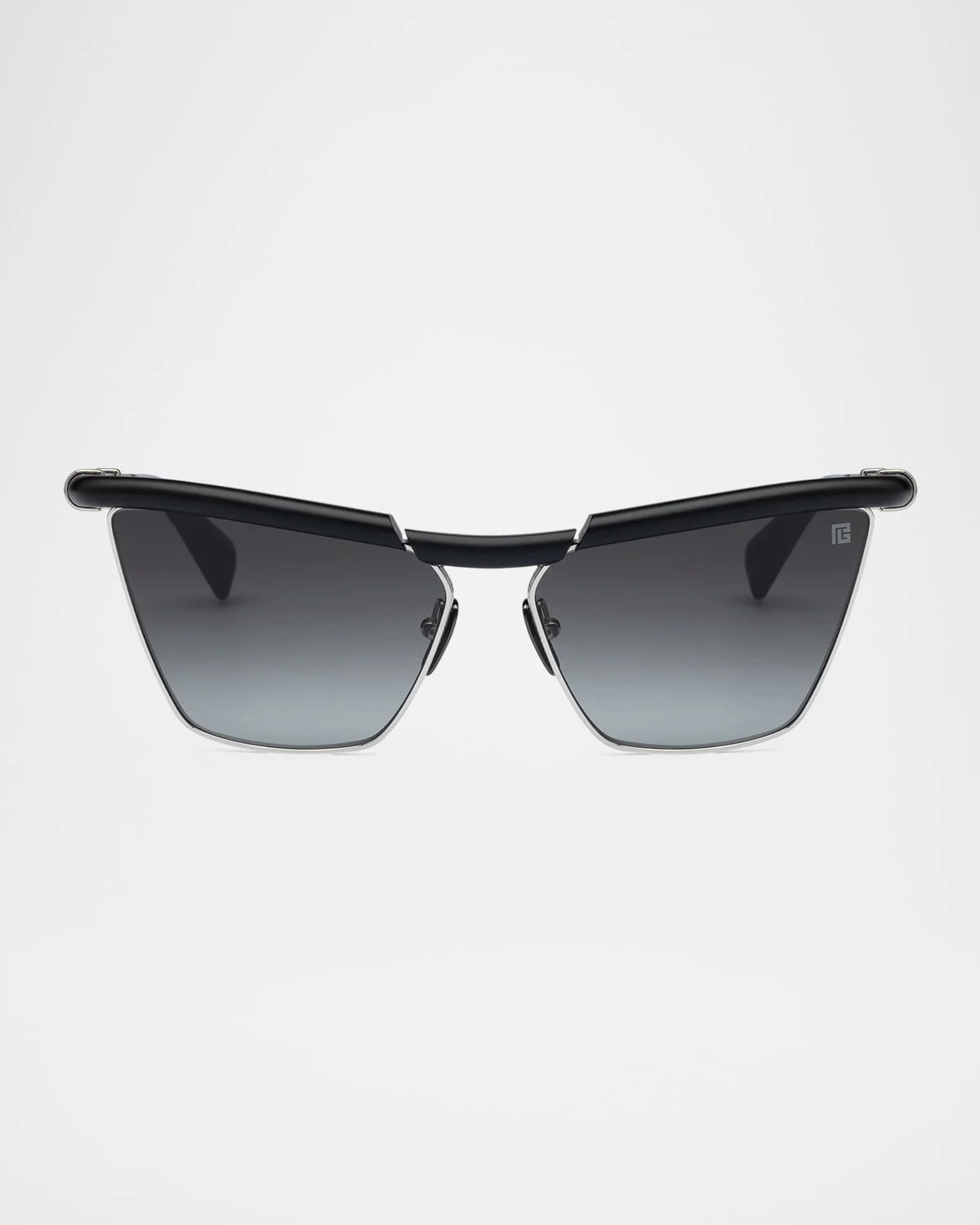 - Balmain "Victorie" cat-eye sunglasses in titanium - Eye/bridge/temple (in mm): 60-14-143 - Solid lenses - Saddle nose bridge - Thin, tapered arms - Monogram at lens - Titanium - 100% UVA/UVB protection - Made in Japan - Proposition 65 warning for California residents