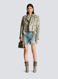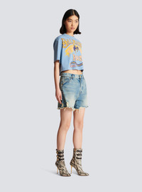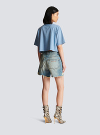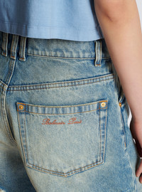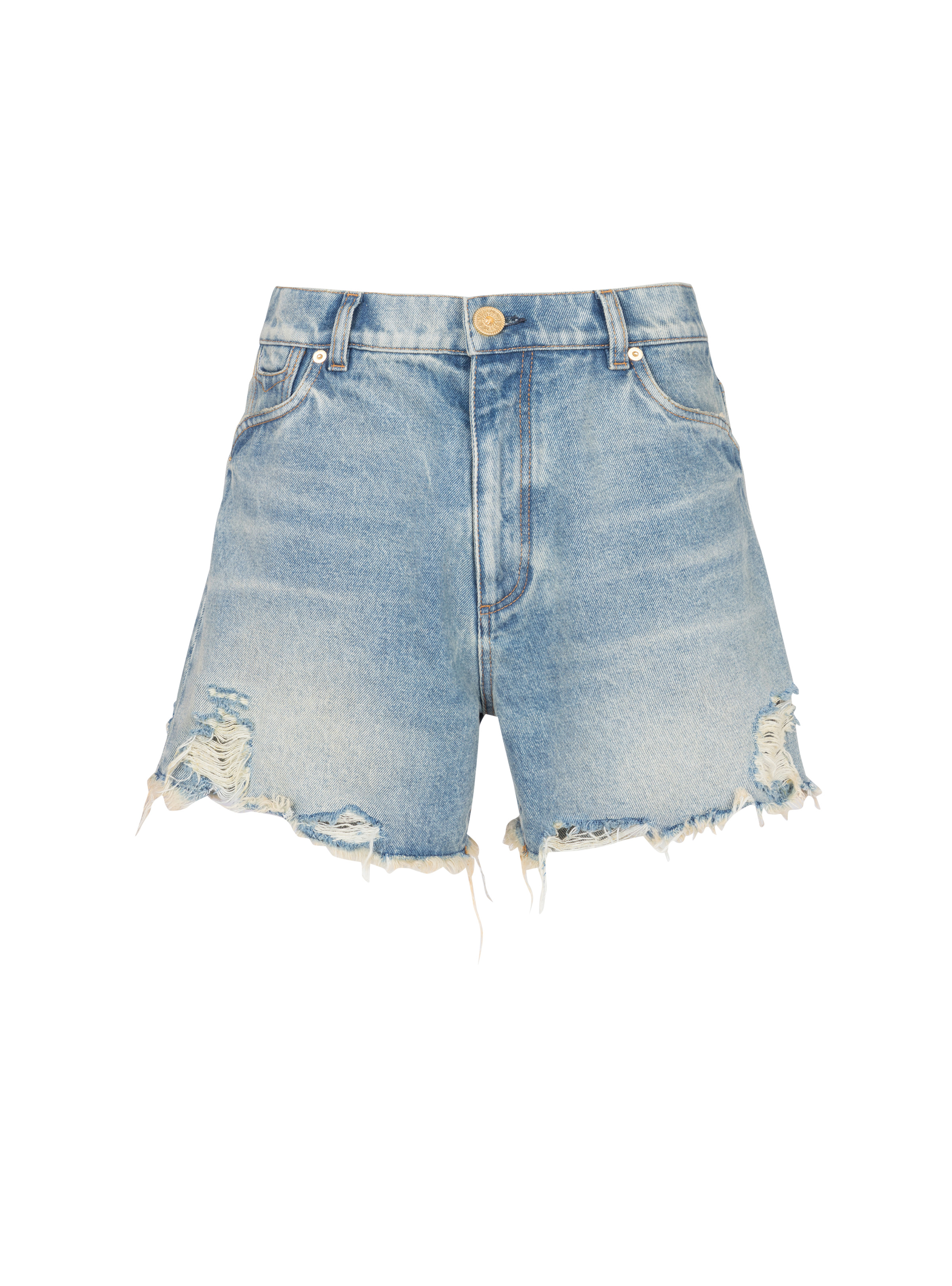 Vintage denim shorts - Vintage worn-effect wash - Loose fit, 5 pockets - Western cut-out detailing - Fastening with Balmain golden metal zip and button - Triple belt loops - Signature Balmain logo embroidered on the back pocket - Worn-effect fringed finish - Model measures 178cm and wears a size 36 - Main material: 100% cotton - Made in Italy - Item: CF1MA120DE04