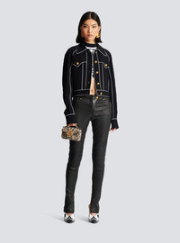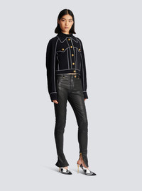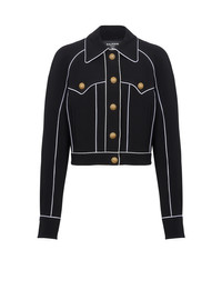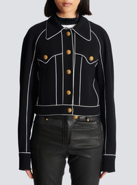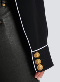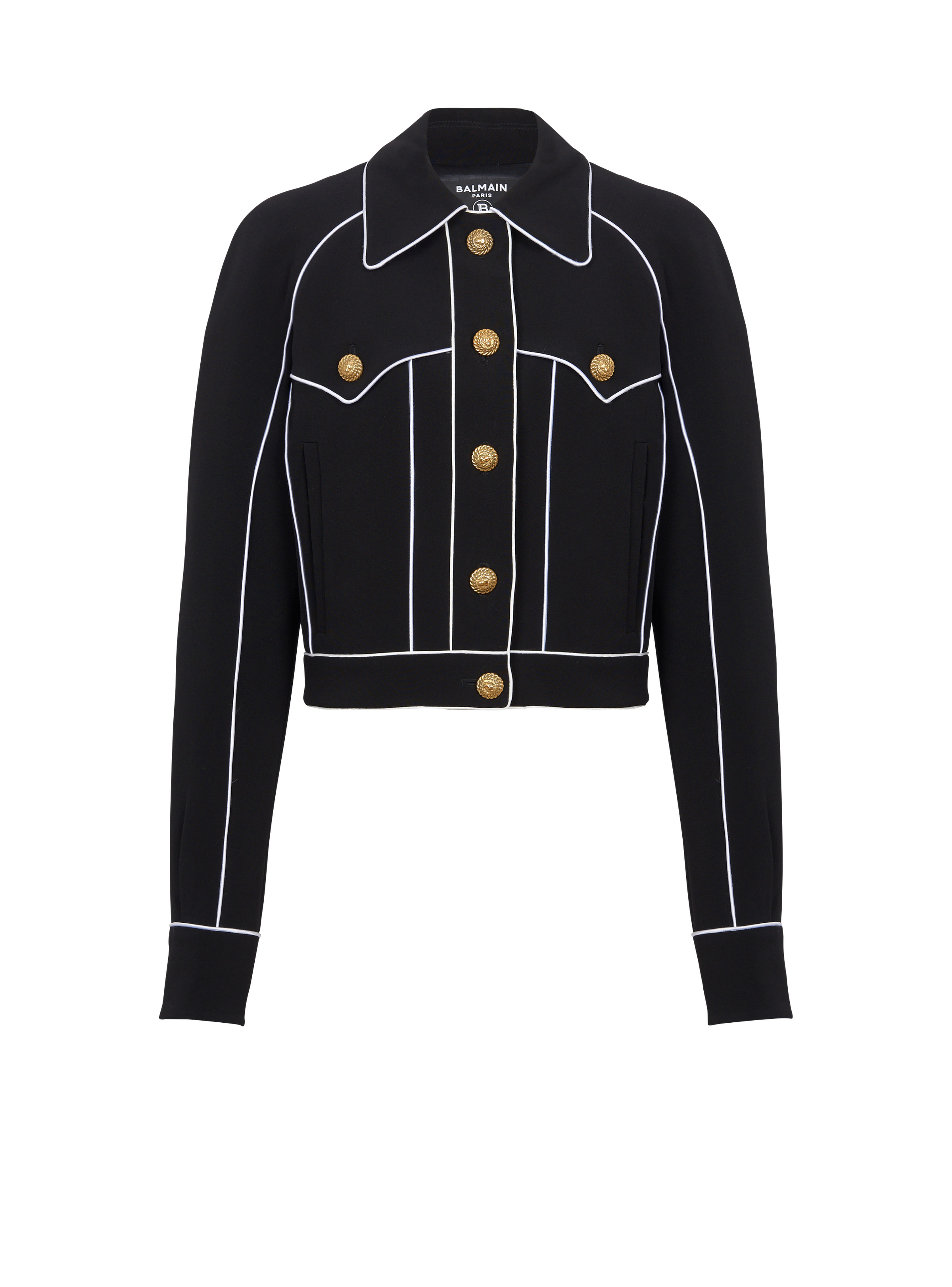 Western crepe jacket with cut-outs - Contrasting piped trim - Tight fit - Tailored collar - Long sleeves - Suit-style cuffs, 3 golden metal “Signature Lion” buttons - Fastening with 5 “Signature Lion” golden metal buttons on the front - 2 slanted pockets - Model measures 178cm and wears a size 36 - Main material: 100% viscose - Made in Slovakia - Item: CF1TC120VB00100% of the viscose fibres used to make this garment come from responsibly managed and FSC®-certified forests