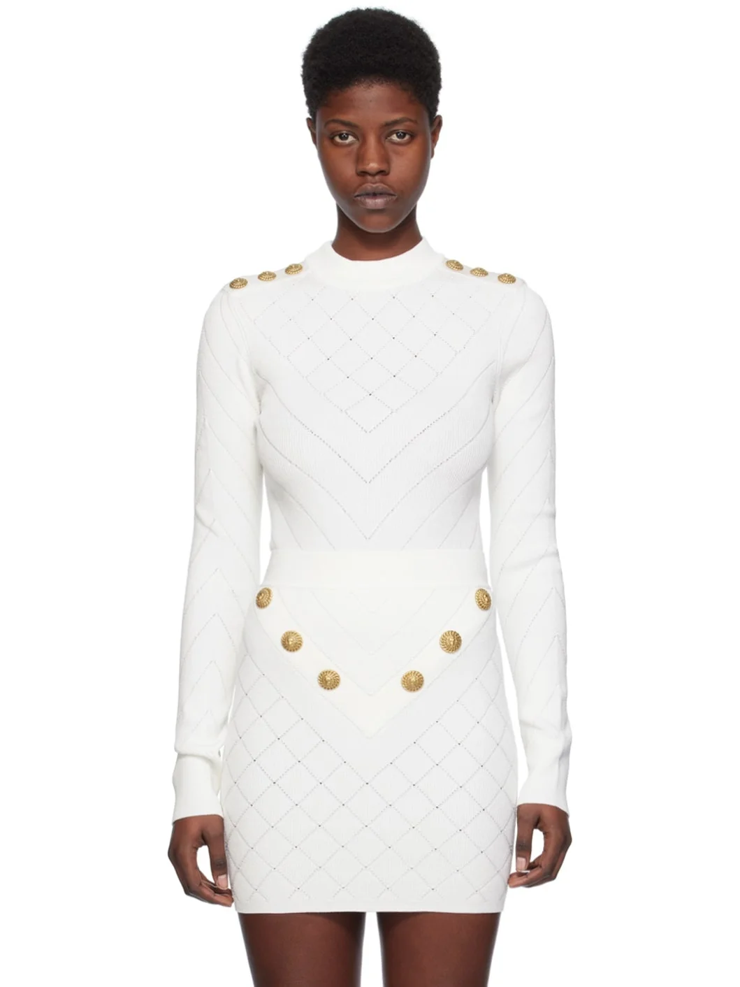 FSC-certified viscose-blend pointelle bodysuit. · Rib knit crewneck and cuffs · Press-stud closure at bottom · Button hardware at shoulders · Cutout at back · Logo-engraved gold-tone hardware Supplier color: Blanc 83% viscose, 17% polyester. Made in France 241251F358000