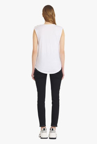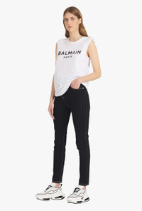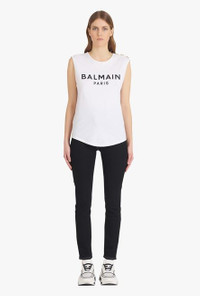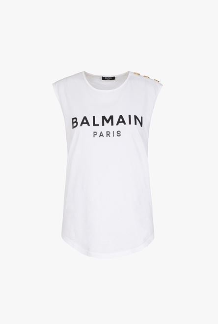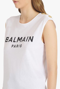 White and black organically cultivated cotton T-shirt Sleeveless, crew neck, embossed gold-tone buttons on shoulder, flocked black Balmain logo ITEM INFORMATION - Casual cut - Fits true to size, select your usual size - The model is wearing FR size 36 - The model's height is 179 cm / 5 ft 10.5 in, bust 84 cm / 33 in, waist 60 cm / 23 in, hips 94 cm / 37 in - Made in Portugal - Material: 100% Organically cultivated cotton - Item: WF1EB005B044GAB