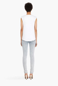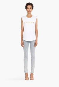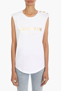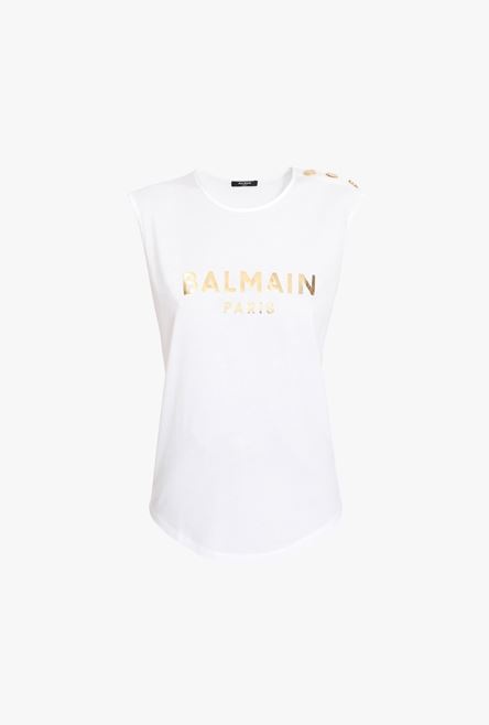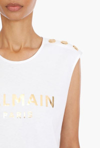 White and gold organically cultivated cotton T-shirt Sleeveless, embossed gold-tone buttons on shoulder, gold Balmain logo print ITEM INFORMATION - Relaxed fit - Fits true to size; select your usual size - The model is wearing a size FR 36 - Material: 100% Organically cultivated cotton - Item: VF0EB005B020GAD