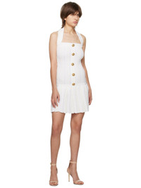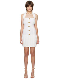 Hemp and viscose-blend tweed dress. Pleats throughout. · Square neck · Button detailing at front · Press-stud fastening at halter strap · Zip closure at back · Unlined · Logo-engraved gold-tone hardware Supplier color: Blanc 32% hemp, 30% viscose, 18% polyamide, 9% cotton, 6% polyester, 5% linen. Made in France 231251F052044