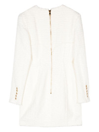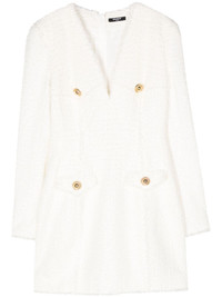 button-embellished tweed minidress Balmain’s dress is cut from white tweed to a tailored V-neck silhouette. It’s adorned with polished gold-tone logo buttons that have remained a hallmark of the brand since the 1940s. Highlights - White - Tweed - V-neck - Frayed edge - Shoulder pads - Faux pocket detail - Gold-tone buttons - Long sleeves - Buttoned cuffs - Dart detailing - Thigh-length - Full lining - Straight frayed hem - Rear zip fastening - Branded zip puller Imported Composition Outer: Polyamide 79%, Virgin Wool 15%, Cotton 6% Lining: Viscose 52%, Cotton 48% SIZE & FIT FittingInformation Designed for a slim fit that sits just away from the body offering a close yet comfortable fit The internal shoulder pads offer a structured shape Made from a midweight non-stretch fabric This piece fits true to size – take your usual size