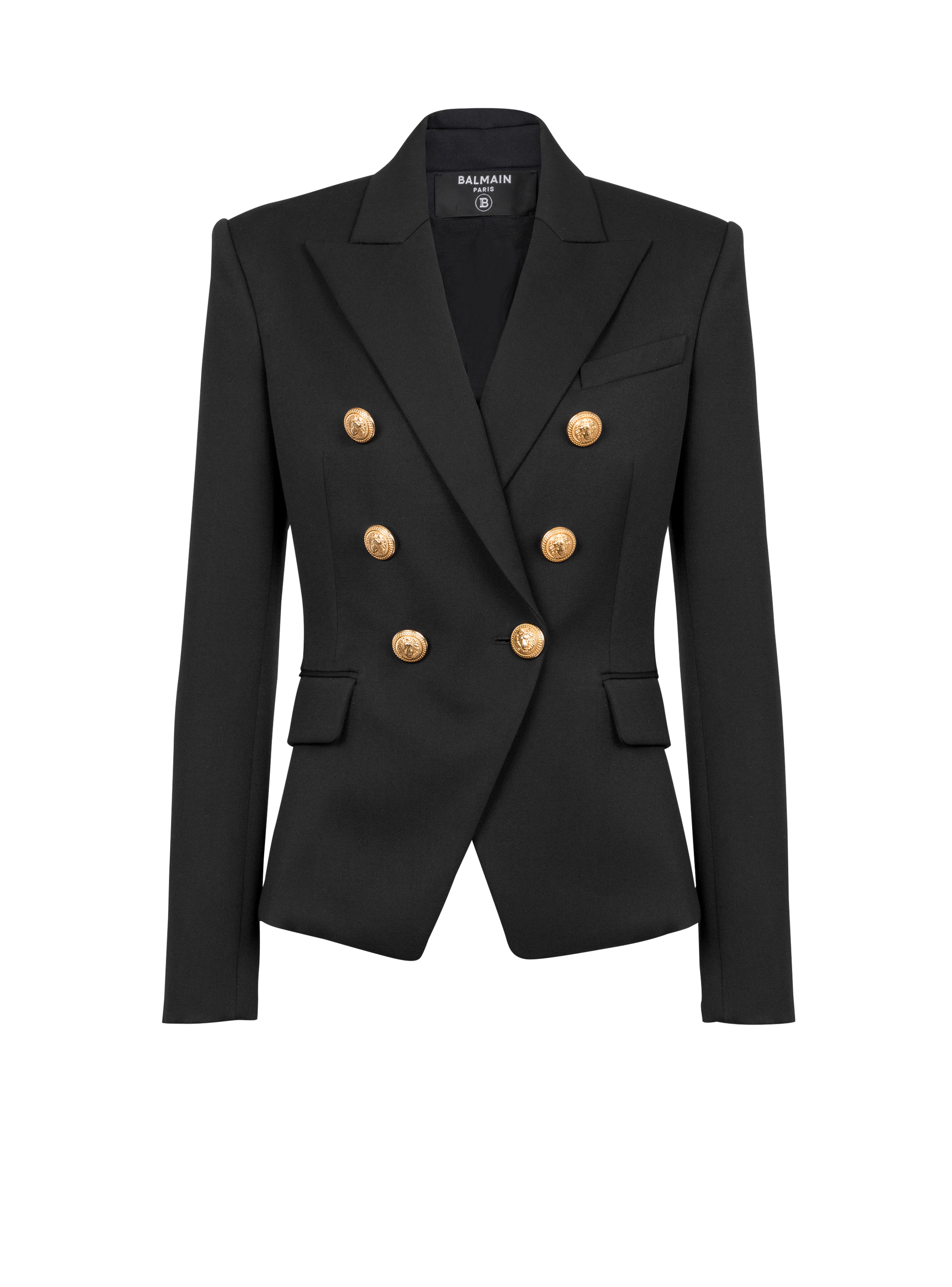 Wool jacket - Structured shoulders - Double-breasted buttoned fastening - Embossed gold-tone buttons - Two flap pockets - Buttoned cuffs - Fitted cut - Fits true to size - Select your usual size - The model is wearing FR size 36 - The model's height is 177 cm - Main material: 100% Wool - Made in Slovakia - Item: CF1SG008WB08