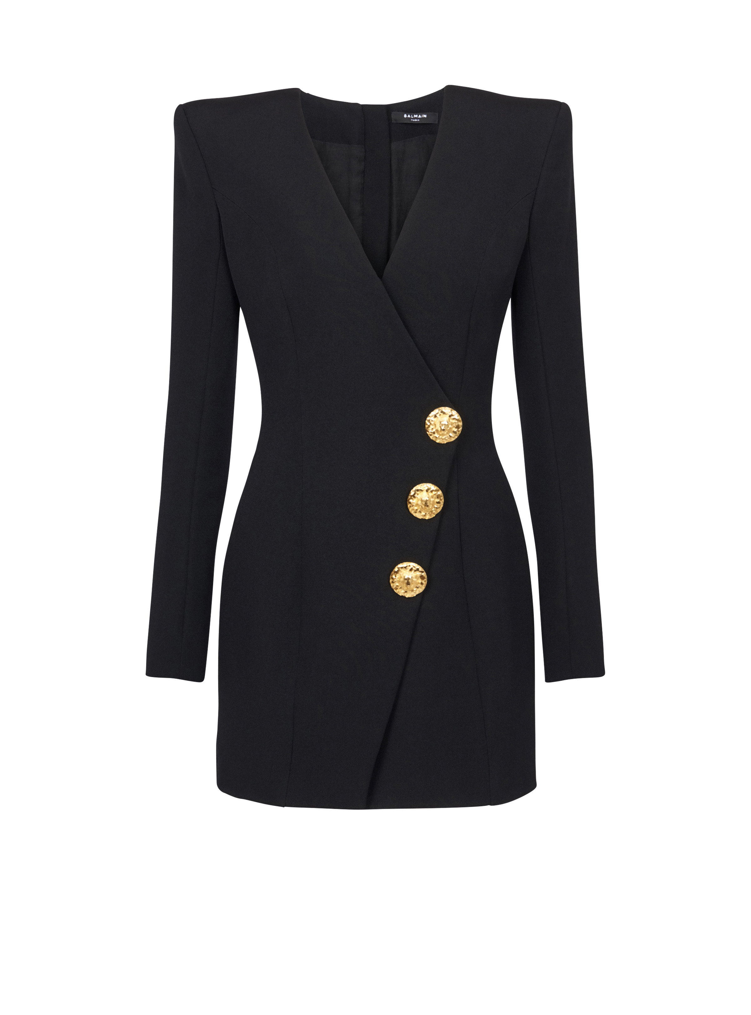 Wool wrap dress - Tight fit - Plunging V-neck - Structured shoulders, long sleeves - 3 decorative, XL golden metal buttons at the front - Tailored cuffs, 5 golden metal 'Lion Head' buttons - Darts at the back - Golden metal zip fastening at the back - Model measures 175cm and wears a size 36 - Material: 100% certified responsible wool - Made in Madagascar - Item: BF1R9535WC09
