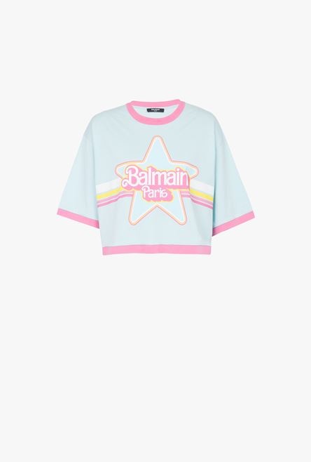 Balmain x Barbie - Blue eco-designed cotton cropped T-shirt with pink Balmain logo print