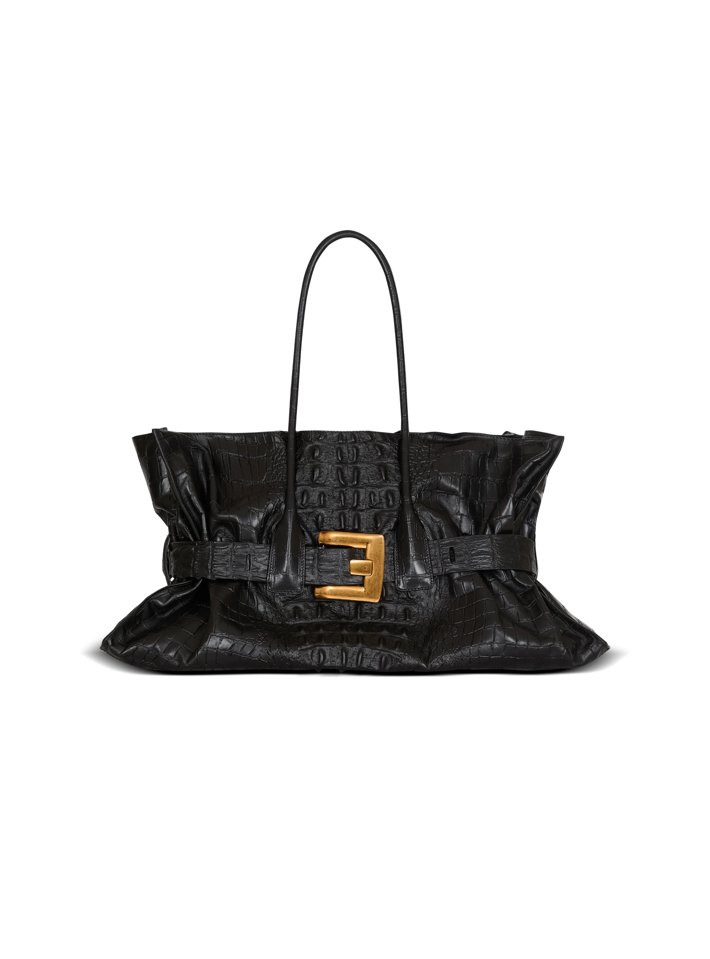 XL Anthem bag in embossed crocodile-print calfskin - Soft belted style - Carry in the hand or wear on the shoulder - Leather handles - Leather belt and belt loops - Metal PB-engraved buckle - Metal PB logo on the back - Closure with chain and T-bar clasp - Inside zipped pocket - Embossed leather inside card pocket - Suede leather lining - Gold hardware - Dimensions: 56 x 30 x 20 cm - Main material: 100% calfskin - Made in Italy - Item: FN4DC992LOBC