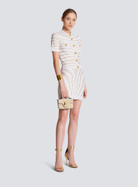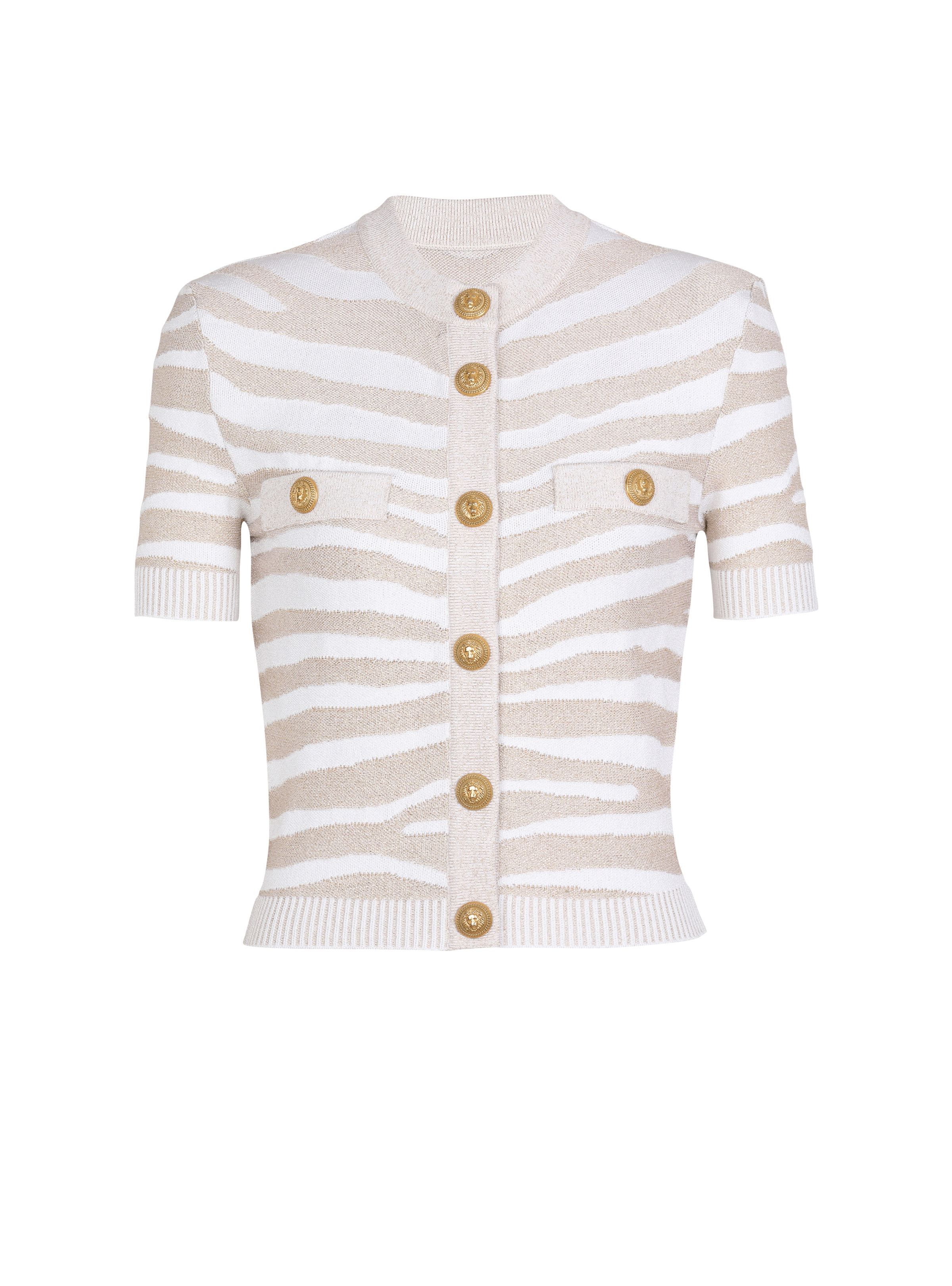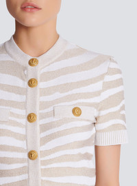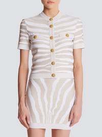 Zebra knit cardigan Round neck, short sleeves, gold embossed buttons Tight fit This item fits true to size (select your usual size) The model is wearing a size S The model's height is 177 cm/5 ft 9 in, bust 81 cm/32 in, waist 58 cm/23 in and hips 89 cm/35 in Made in Italy Material: 67% viscose, 14% polyester, 11% polyamide, 8% metal Item: AF1KL020KD48