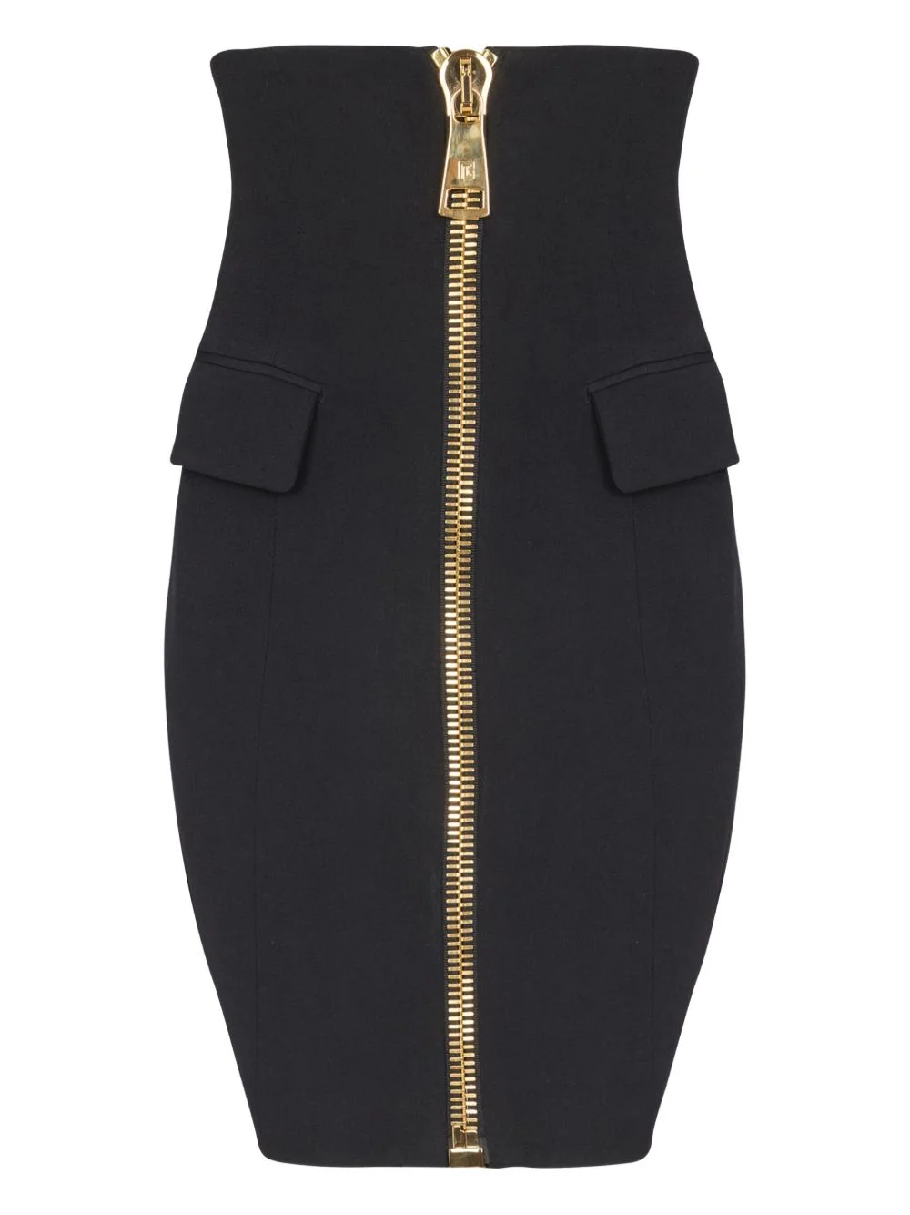 zip-front pocket short skirt Highlights - Black - Gold-zip fastening - Fitted waist - Two-welt pockets - Pencil shape - Grain de poudre wool fabric Imported Composition Wool 100% Washing instructions Read Manufacturer Guidelines