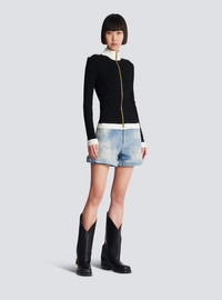 Two-tone openwork and ribbed knit cardigan - High neck - Contrasting shoulder tabs with “Chain Lion” decorative buttons in gold metal - Long sleeves - Visible golden metal zip fastening on the front with Balmain Paris-engraved slider - Contrasting ribbed trim - Fitted cut - Model measures 178cm and wears a size 36 - Main material: 84% viscose 16% polyester - Made in Italy - Item: FF1KL036KI64100% of the viscose fibres used to make this garment come from certified, sustainably managed forests