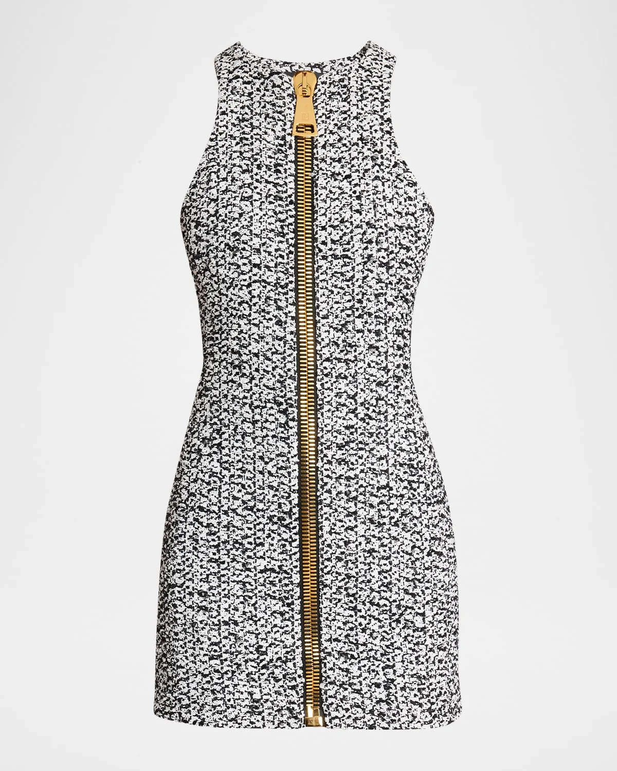 - Crafted in two-tone tweed, this Balmain mini dress is finished with chunky gold-tone hardware for a signature touch. - High neckline - Sleeveless - Figure-hugging silhouette - Hem falls above the knee - Zip-front - Viscose/cotton - Professional cleaning recommended - Imported