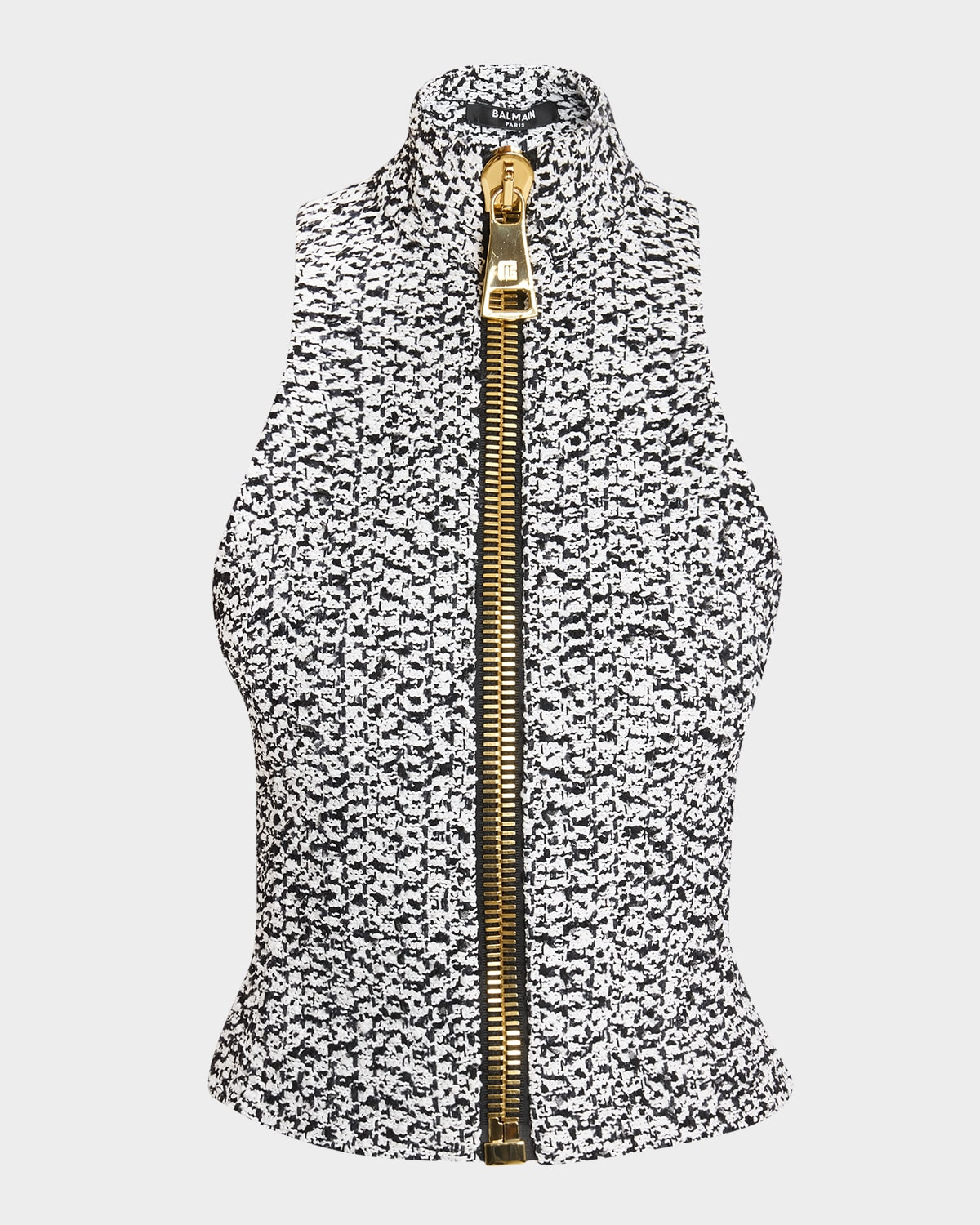 - Crafted in two-tone tweed, this Balmain vest is finished with chunky gold-tone hardware for a signature touch. - Stand collar; zip-front - Sleeveless - Fitted silhouette - Hem sits at the hip - Viscose/cotton - Professional cleaning recommended - Imported
