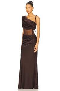 - 100% polyester - Hand wash - Partially lined with mesh bodysuit - Pull-on styling - Draped shoulder accent with side ruched tie closure - Mesh bodice - Heavyweight satin fabric - Revolve Style No. BANH-WD65 - Manufacturer Style No. 2522003