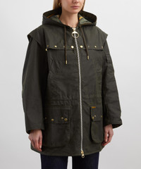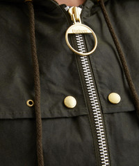 DETAILS Waxed cotton jacket Fixed drawstring hood Front and back yokes Silver zip fastening Metal D-ring Handwarmer pockets Front bellow pockets Branding to left pocket Tartan lining SIZE & FIT Model is 176cm/5'9.5"; Chest: 81cm; Waist: 62.5cm; Hip: 89cm and wears a size 8 COMPOSITION & CARE Outer: 100% Cotton Lining: 65% Polyester; 35% Cotton Do not wash. Sponge clean only