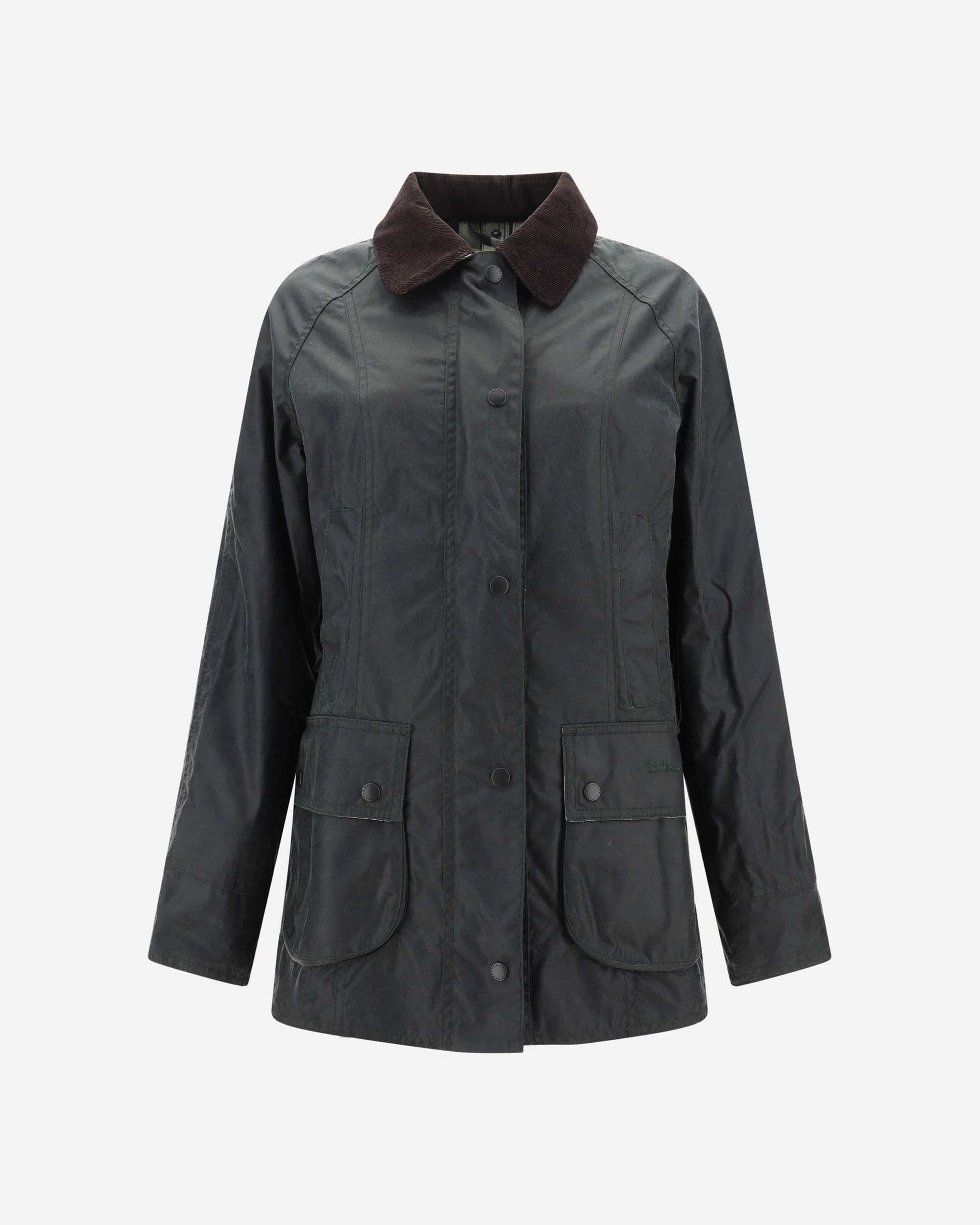 Breadnell Jacket by Barbour, front zipper and concealed snap button closure, classic ribbed collar, two patch pockets with flap for hip closure, tartan patterned interior lining, iconic tone-on-tone embroidered brand monogram on the flap of one pocket, two adjustable slits with snap buttons on the back, regular fit. DETAILS sku LWX0667_SG91 composition: COTTON 100% color group: GREEN gender: WOMAN season: SS25 size chart: RTW UK category name: DOWN JACKETS