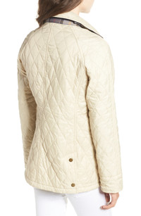A lighter, packable version of Barbour's iconic quilted jacket is shaped for a feminine yet relaxed fit with raglan sleeves and princess seams. Heritage details include a water-resistant, diamond-quilted shell and double vents with snap closures in back. Flip up the collar and roll the cuffs to show off the signature tartan lining. 26 1/2" length (size 8). Front snap closure. Hand-warmer pockets; front snap-flap pockets. Water-resistant. Lined. 100% polyamide. Dry clean or machine wash warm, line dry. By Barbour; imported. Coats.