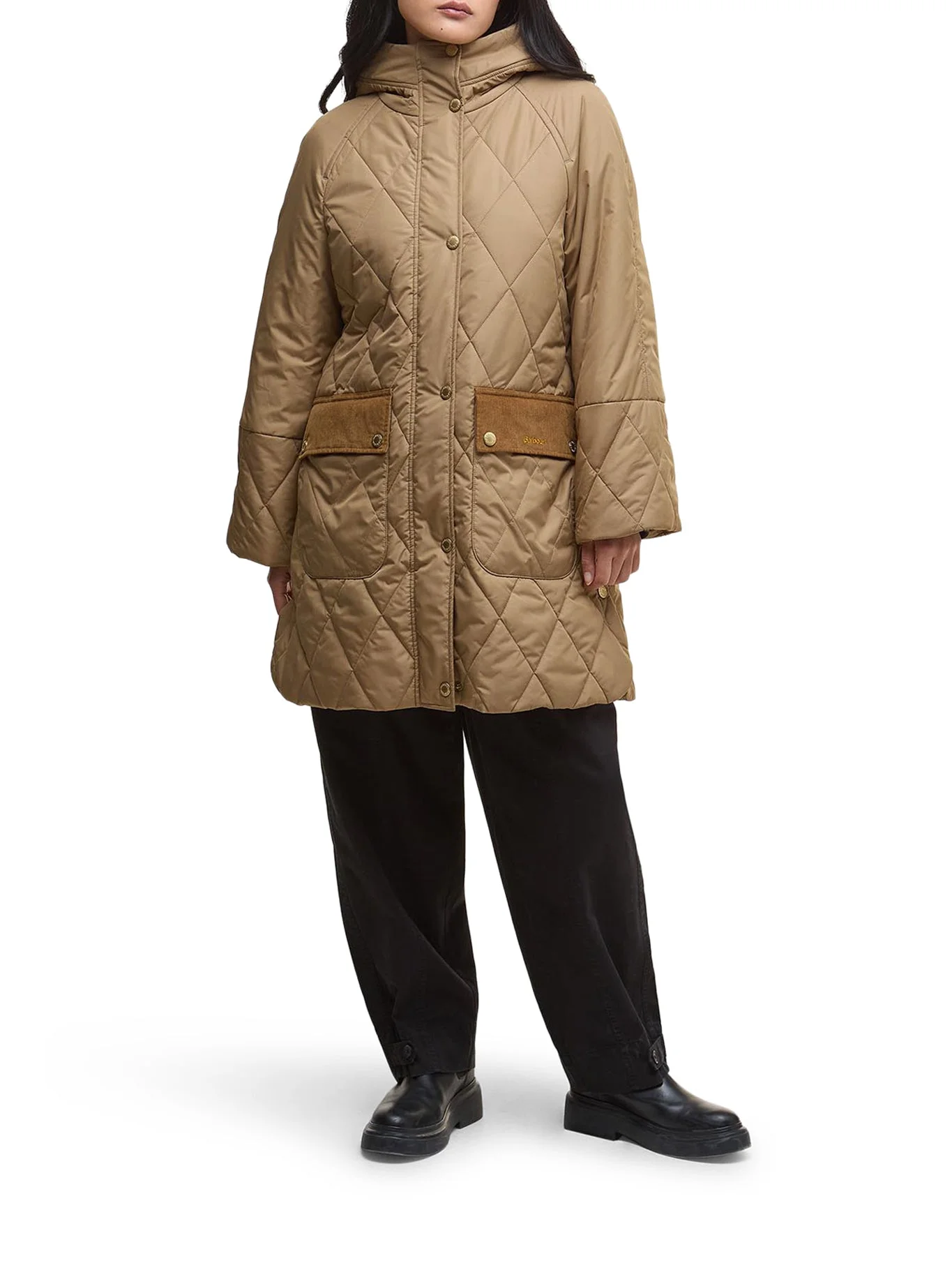 - 10 cm wide diamond quilting - Hood - Front zip and snap closure - Long raglan sleeves - Two front patch pockets with corduroy flaps and snaps - Embroidered logo on the left flap - Side slits with snaps - Tartan lining - Color military brown Made in Vietnam Composition: Polyester 100%POLYESTER Color code: BE31 MILITARY BROWN ANCIENT TARTAN LQU1841LQU