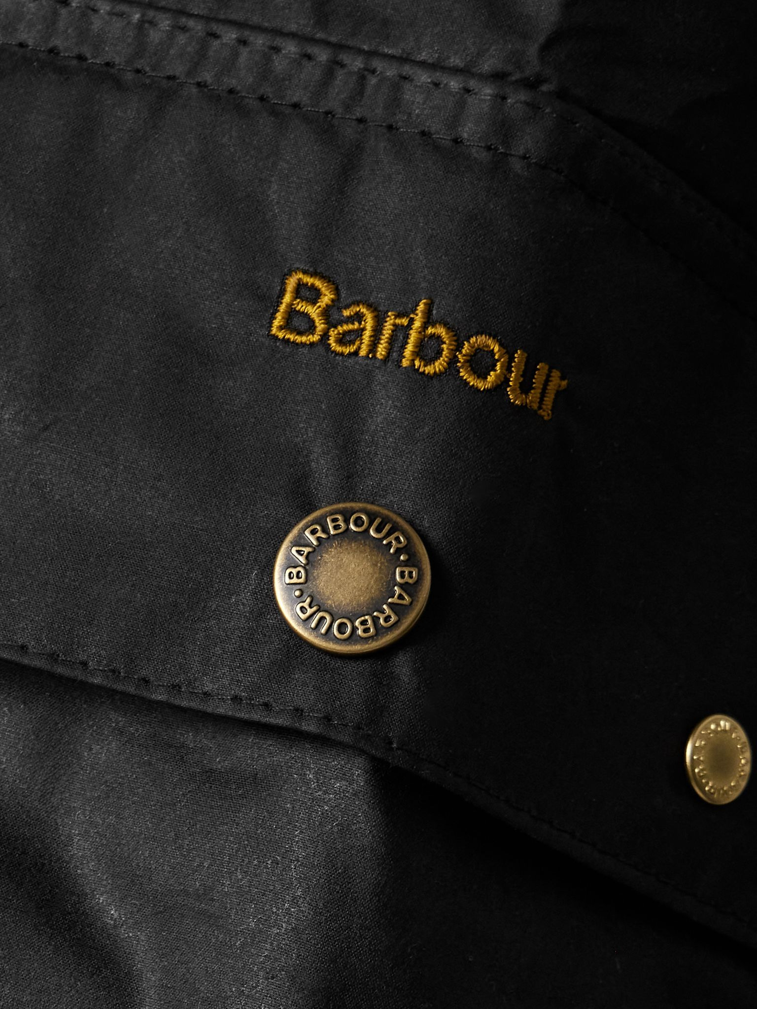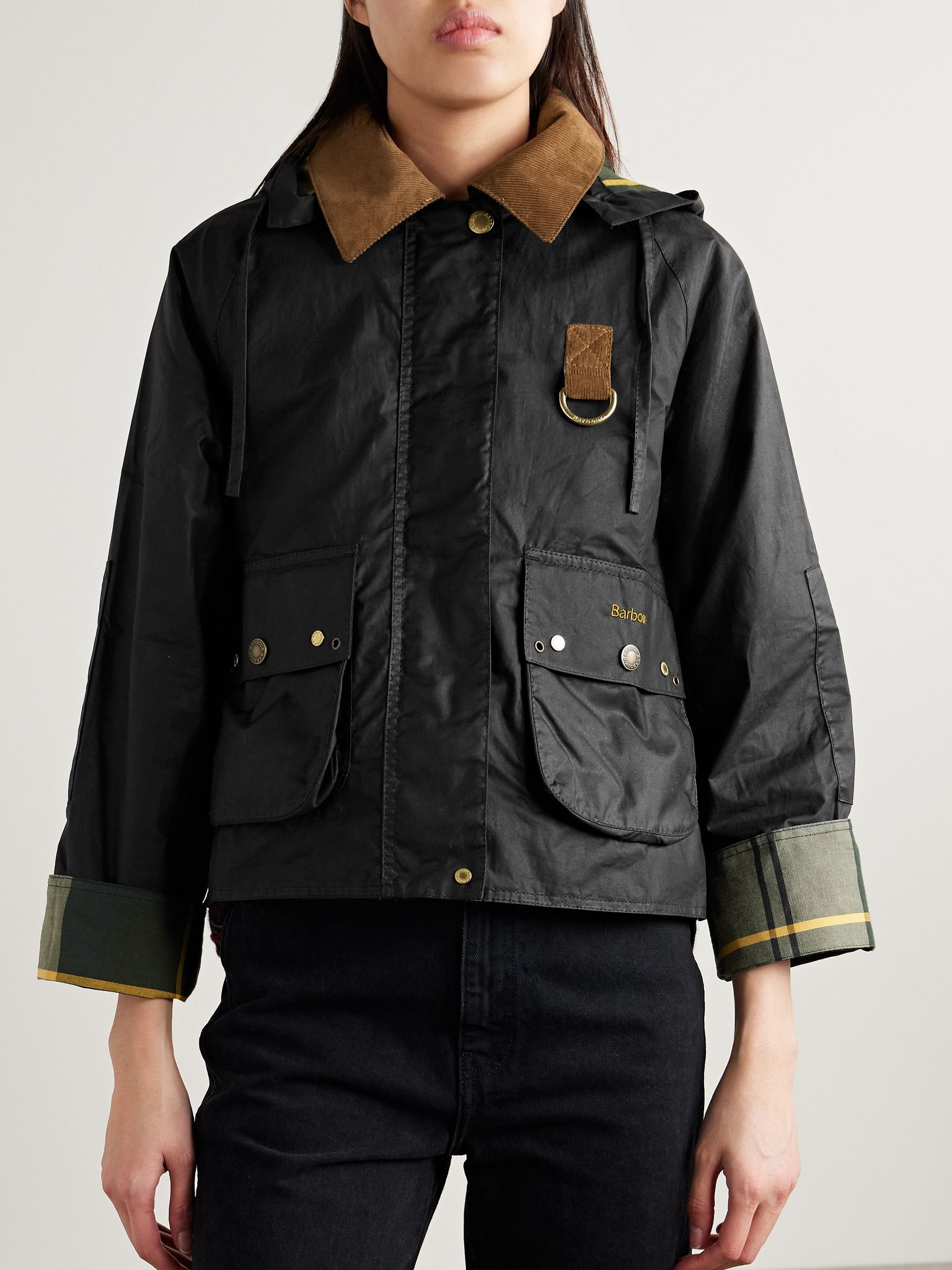 Barbour's 'Erma' jacket is a fresh take on the house's iconic 'Spey' style. Made from water-repellent waxed-cotton, it has a cozy cotton corduroy-trimmed collar and classic tartan lining, which peeks out on the detachable hood and rolled cuffs. There are plenty of pockets and heritage D-ring hardware. Size & Fit - Fits true to size, take your normal size - Designed for a relaxed fit - Slightly short in the body - Mid-weight, non-stretchy fabric - Model is 180cm/ 5’11” and is wearing a UK 8 Model measurements: - Bust: 79cm/ 31” - Waist: 61cm/ 24” - Hip: 89cm/ 35” Details & Care - Black waxed-cotton, brown cotton-corduroy - Partially concealed snaps and zip fastening through front - 100% cotton; trim: 100% cotton; lining1: 55% polyester, 35% cotton; lining2: 100% polyester; lining3: 100% recycled polyester - Spot clean