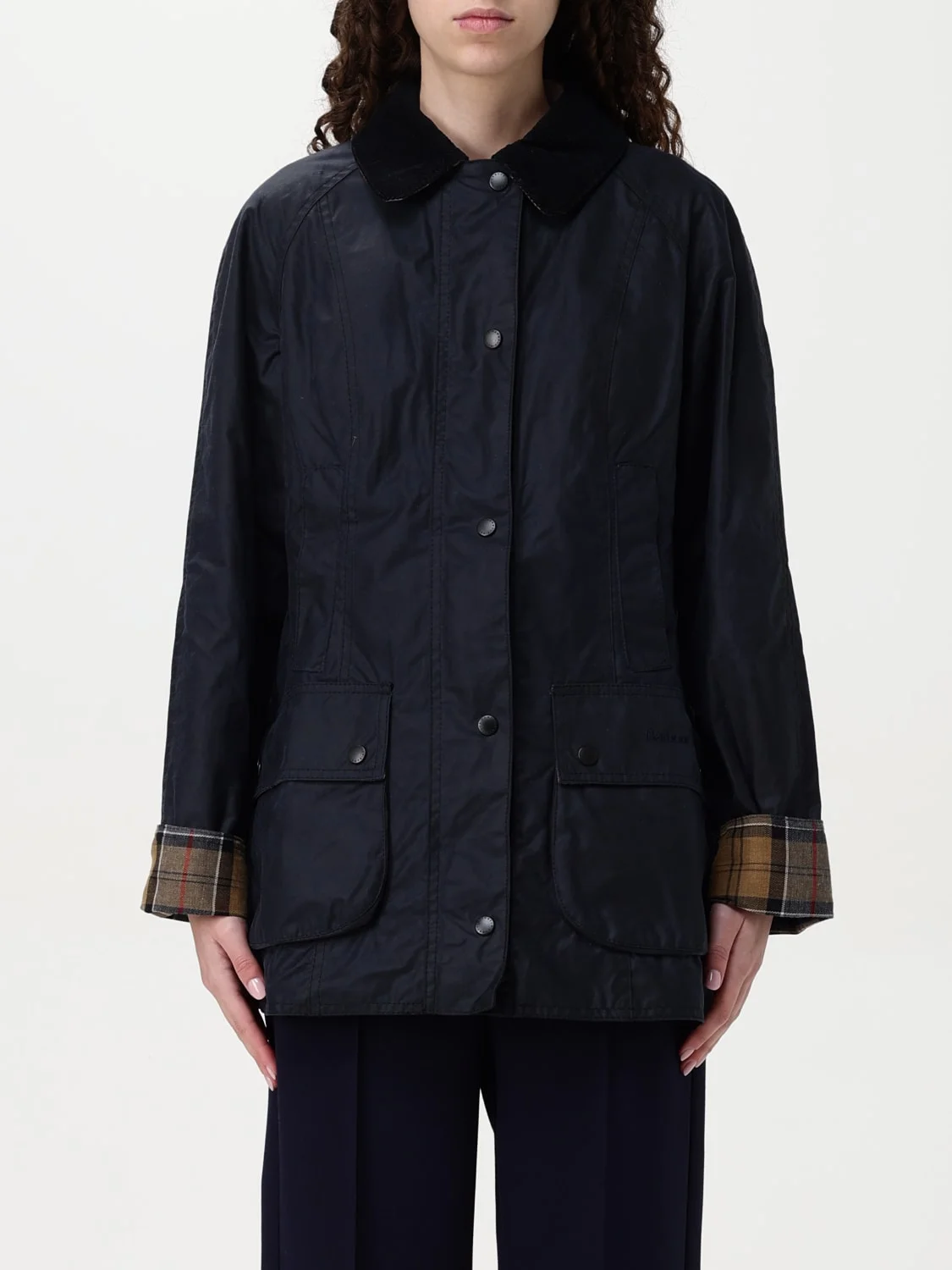 DESCRIPTION - Style: Classic - Neck: Corduroy - Shoulders: Relaxed - Sleeves: Long - Closure: With zip and concealed buttons - Bottom: With straight hemline - Pockets: Patch with flap - Length: Short jackets - Materials: Waxed cotton - Pattern: Plain-colored DETAILS AND CARE Composition 100% WAXED COTTON SIZE AND FIT Sizes not available Size and fit Relaxed fit Designer code: LWX0667 NY91 Giglio Code: 429420 Designer: Barbour Collection: Barbour Woman Category: Clothing Barbour