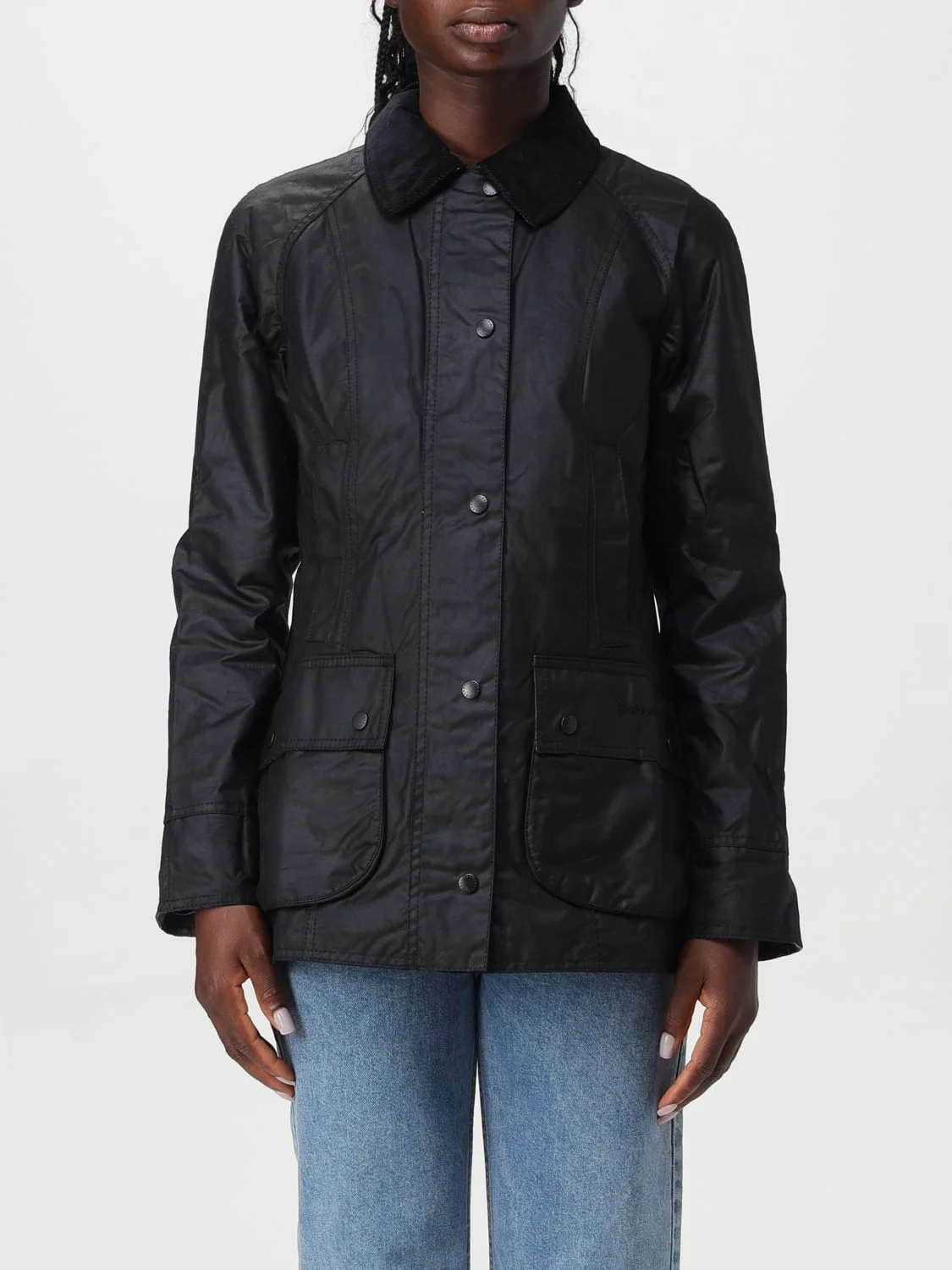 DESCRIPTION - Style: Classic - Neck: Corduroy - Shoulders: Regular - Sleeves: Long - Closure: With zip and concealed buttons - Pockets: Patch pocket with flap and button - Bottom: With straight hemline - Length: Short jackets - Materials: Waxed cotton - Pattern: Plain-colored DETAILS AND CARE Composition 100 AF SIZE AND FIT Sizes not available Size and fit Slim fit Designer code: LWX0667 BK11 Giglio Code: 417646 Designer: Barbour Collection: Barbour Woman Category: Clothing Barbour