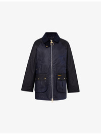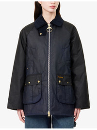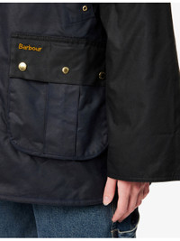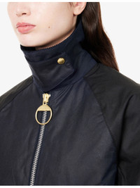 PRODUCT DETAILS - Barbour waxed-cotton jacket - 65% polyester, 35% cotton - Exposed zip fastening - Relaxed fit, raglan long sleeves, cord collar, two welt pockets at waist, two patch pockets at front, branded hardware, fully lined, zipped pocket at interior, embroidered logo at pocket - Sponge clean - True to size - Size UK 8: length 31in / 78.7cm - Model is 5ft 10in/1.78m and wears a size UK 8 - Midweight, non-stretch Ref: R04563900