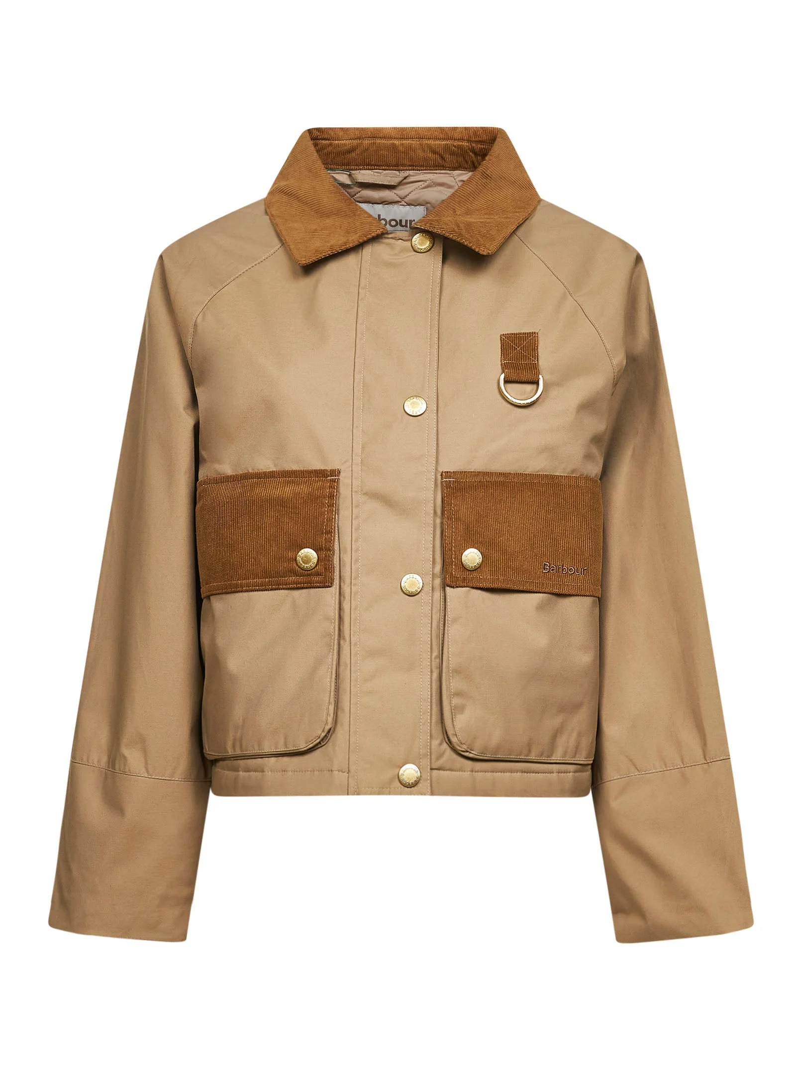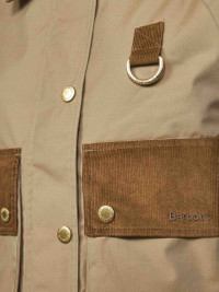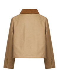 - Front covered zip and snap button placket - Oversized corduroy collar - Long sleeves, raglan shoulders, snap-buttoned cuffs - Corduroy loop-tab with metal d-ring at chest - Front bellows pockets with snap-buttoned corduroy flap - Lined - Waxed cotton blend design - Brown color - 59% cotton, 41% polyamide - Made in extra eu Natural (Veg): Cotton59 % Synthetic: Polyamide41 % Made in: Vietnam Season: A25 LCA0371LCABR31