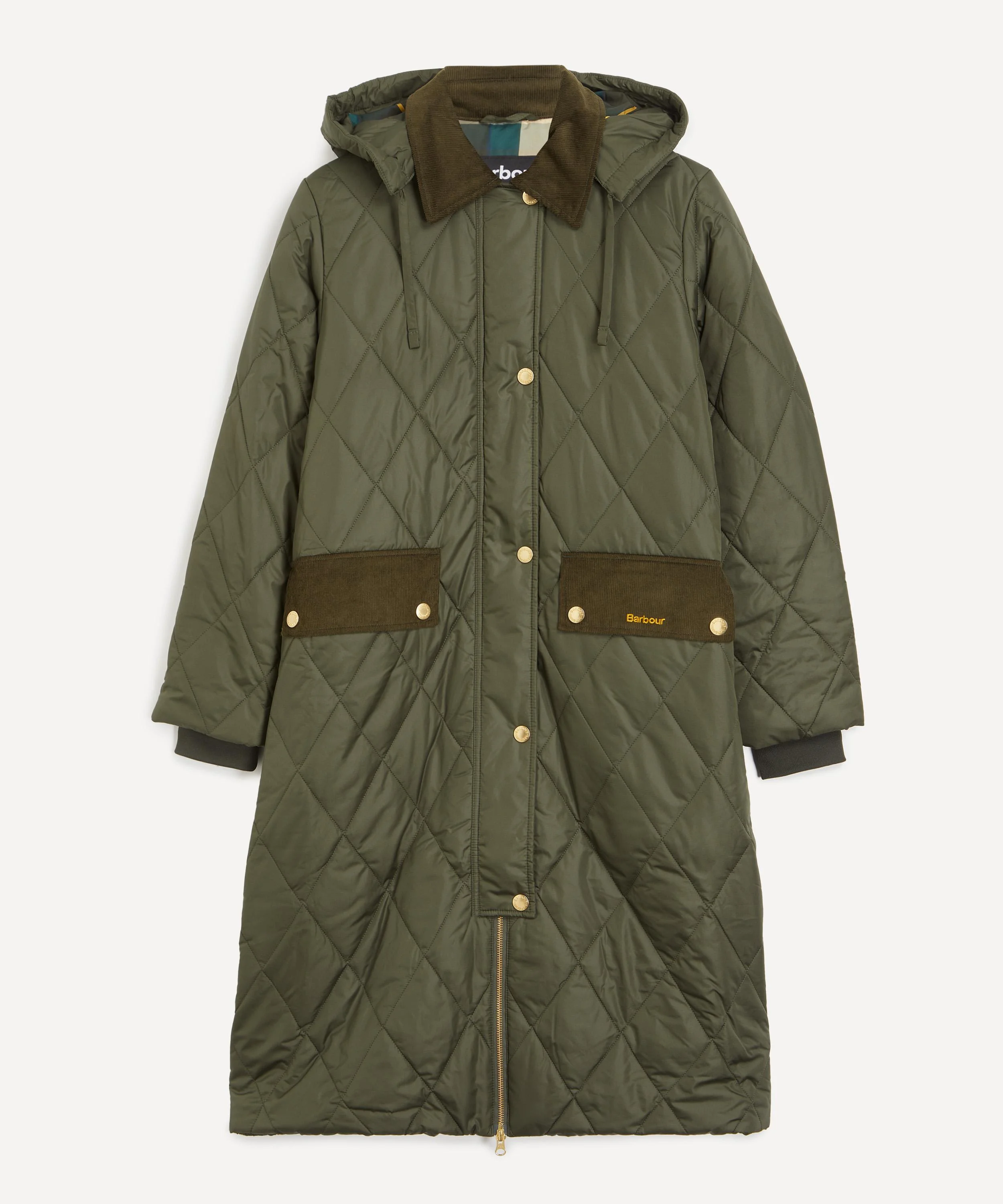 DETAILS Quilted jacket Longline Detachable hood Extended ribbed cuffs Cord collar Stud placket Concealed zip fastening Branded pull ring Bellow pockets Branding to left pocket Cord trims Tartan lining SIZE & FIT Model is 176cm/5'9.5"; Chest: 81cm; Waist: 62.5cm; Hip: 89cm and wears a size 8 COMPOSITION & CARE Outer: 100% Polyester Inner: 100% Polyester Collar: 100% Cotton Machine wash 30°C