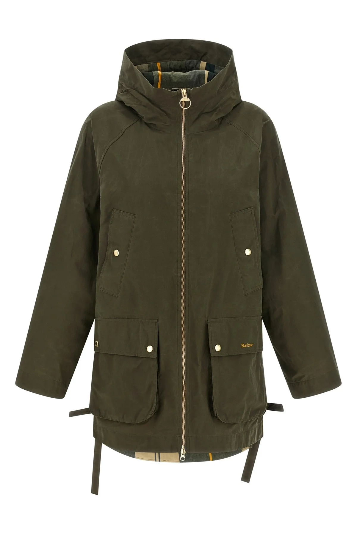 cod. LSP0305LSPOL72 'Middlemarch' rainproof jacket in cotton blend that is dry to the touch with tartan details inside the hood and turn-ups, parka model, elongated and flared silhouette, adjustable hood, high neck, logo embroidery and front zip closure, pockets, adjustable raglan long sleeves with snap button on the cuffs and fold-up, side slits with fabric laces, and asymmetrical hem. Color: Green Size & Fit: true to size fit - UK sizing Composition: 70% cotton 30% polyamide Made in: Vietnam