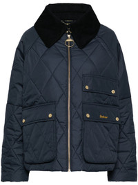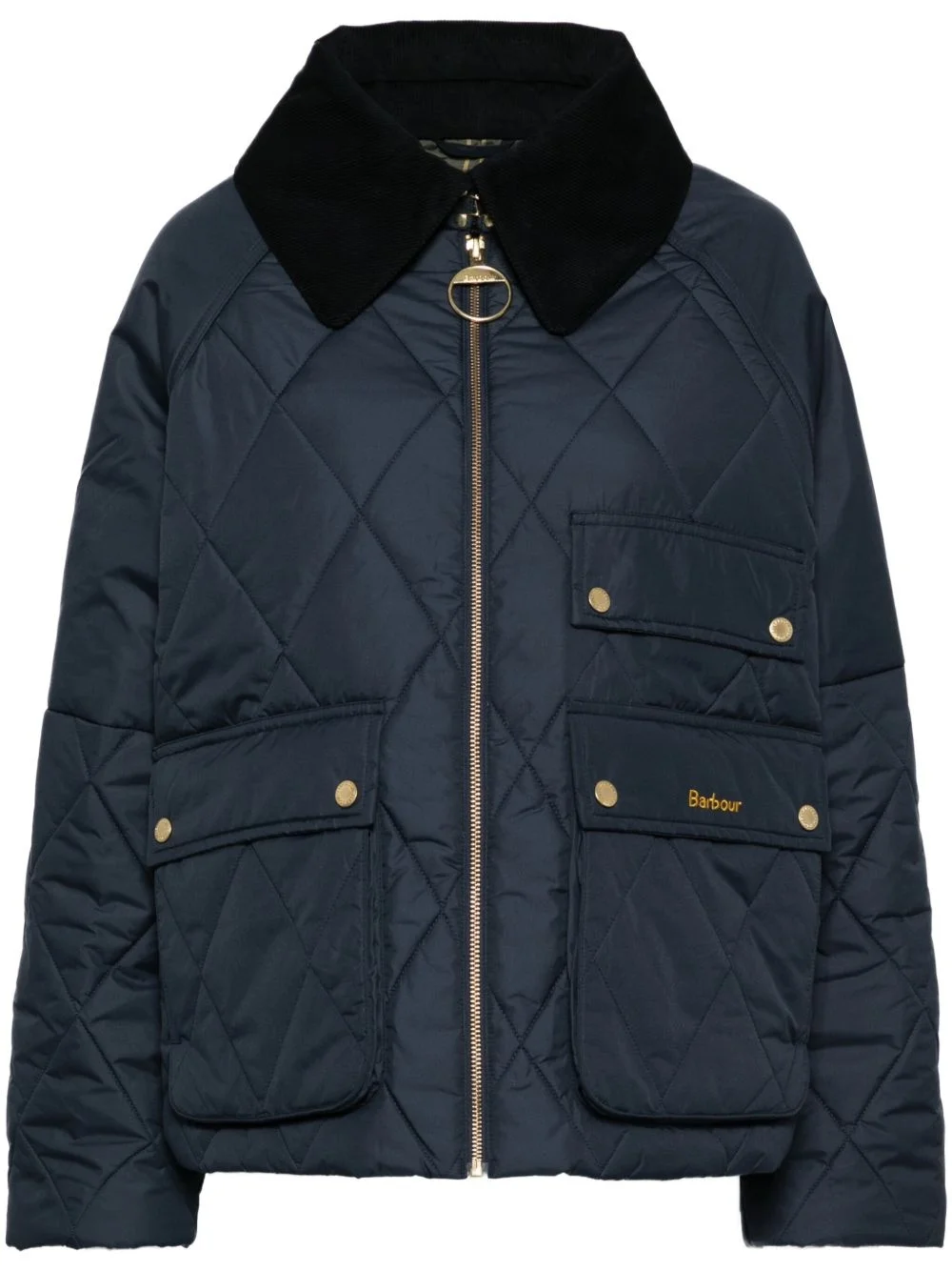 Nilby quilted jacket Highlights - Navy blue - Front zip fastening - Corduroy collar - Three front patch pockets Imported Composition Cotton 100% Lining: Polyester 100% Outer: Polyester 100% SIZE & FIT Model measurements Height 5 ft 10 in(1.78 m) Bust/Chest 24.4 in(62 cm) Hips 35.43 in(90 cm) Waist 31.88 in(81 cm) FittingInformation Designed for a boxy fit, intended for a loose fit throughout Made from a padded non-stretch fabric, giving it no natural elasticity Washing instructions Machine Wash