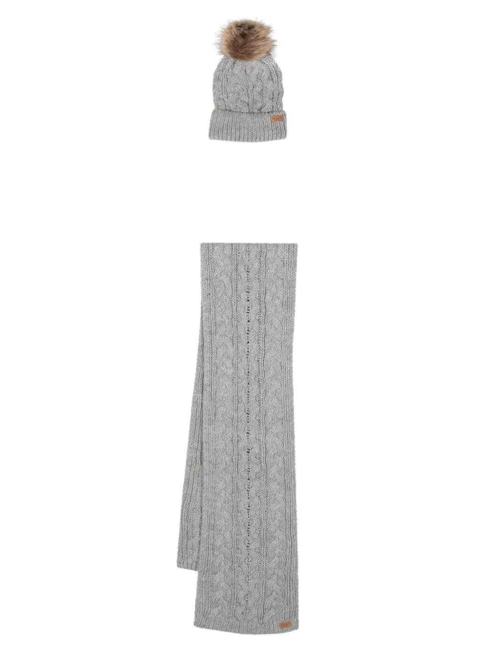 pompom-detail cable-knit scarf set Highlights - Grey - Cable knit - Pompom detail - Turn-up brim - Logo patch to the front - Finished edge Made in United Kingdom Composition Acrylic 100% SIZE & FIT Measurement LENGTH 66.92 in(170 cm) WIDTH 9.84 in(25 cm) Washing instructions Hand Wash