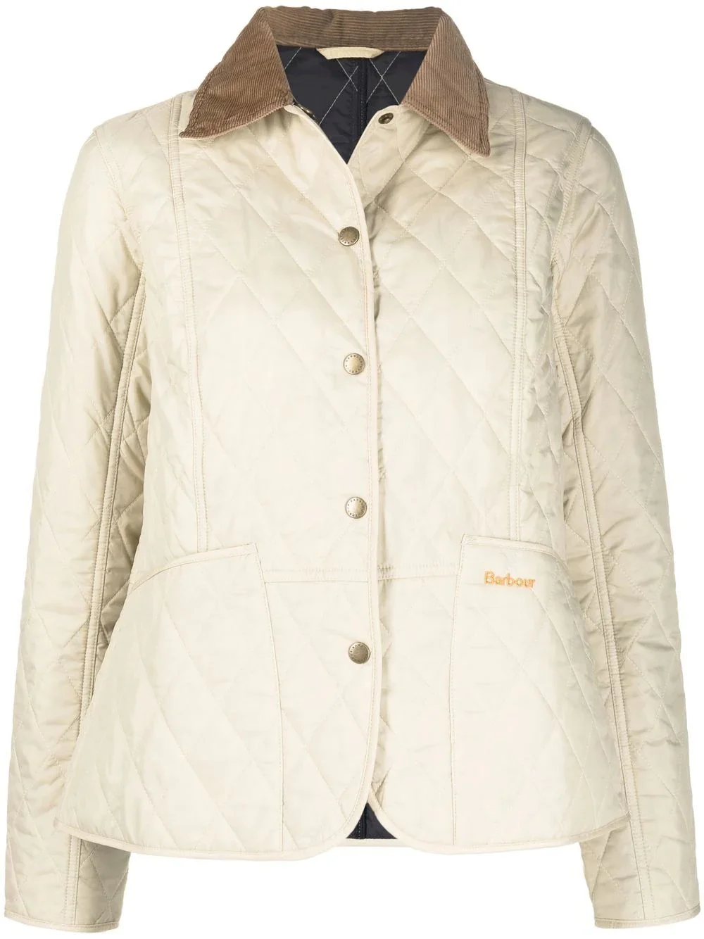 Summer Liddesdale quilted jacket pearl white/navy cotton blend diamond quilting contrasting collar front press-stud fastening long sleeves multiple patch pockets Imported Composition Outer: Polyamide 100%, Cotton 100% Lining: Polyester 100% Washing instructions Machine Wash