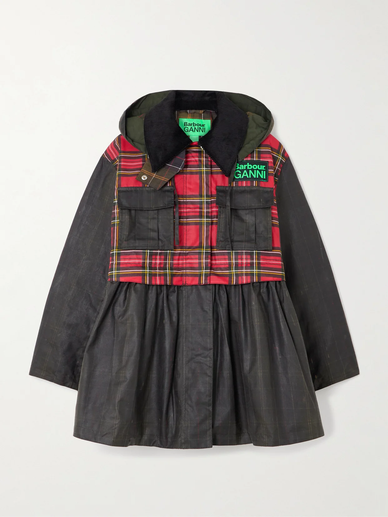 + Ganni Hooded Corduroy-trimmed Checked Waxed-cotton Peplum Jacket