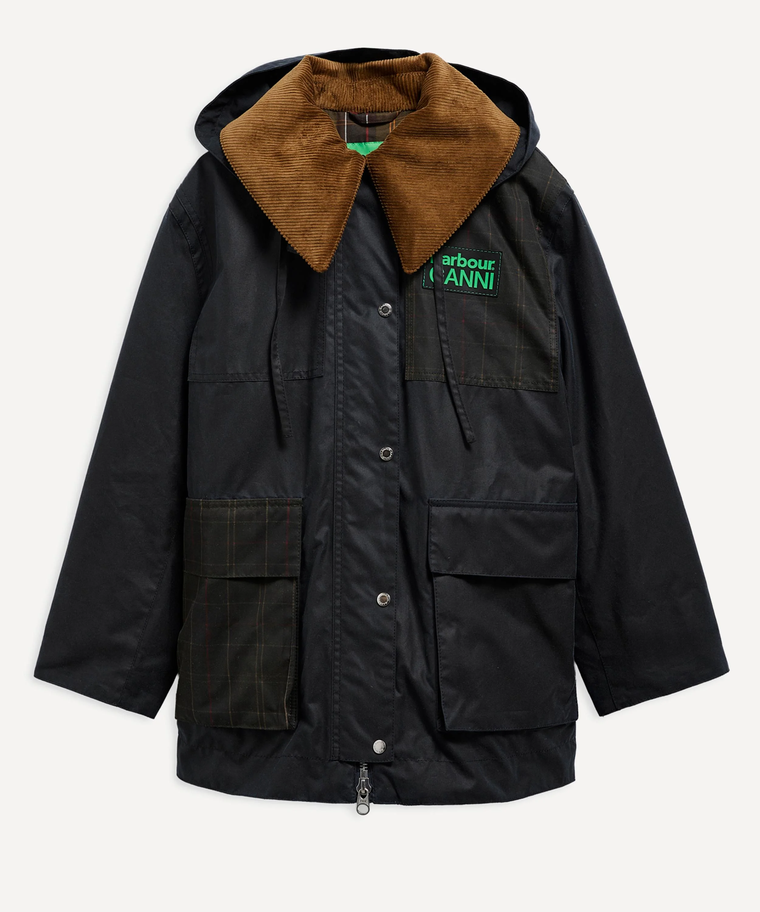 DETAILS Waxed Duffle Coat Barbour x GANNI collaboration Waxed cotton Contrasting patchwork to body and elbow patches Oversized corduroy collar Hooded Snap closure with concealed zipper Dual-branded ring pull Bellow pockets Barbour x GANNI co-branded silicone patch Tartan lining COMPOSITION & CARE 100% Cotton Do not wash. Sponge clean only