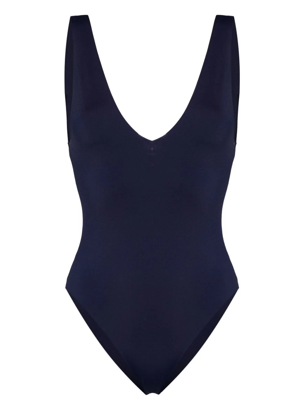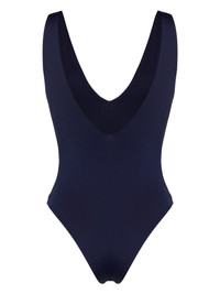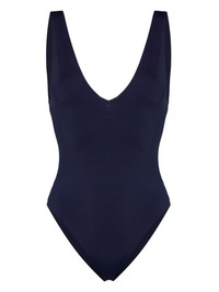Regina V-neck swimsuit Highlights - Navy blue - Stretch-design - V-neck - Low back - Wide shoulder straps - Slip-on style - Full lining - Be mindful to try on swimwear over your own garments. Made in Italy Composition Outer: Polyamide 82%, Elastane 18% Lining: Cotton 100%