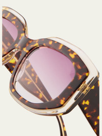 The "Crescendo" sunglasses by Barton Perreira builds in layers. Its bold silhouette, sculpted through precision beveling and rich acetate laminations, plays with depth and transparency. Every angle of the frame pulses with visual rhythm. Designed for those who appreciate substance beneath simplicity, Crescendo is a beautiful combination of color, contour, and considered construction. Lens/bridge/temple (in mm): 50.519145 Square frames Gradient lenses with antireflective coating Fixed nose pads Wide, tapered arms Acetate 100% UVA/UVB protection Made in Japan