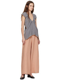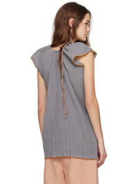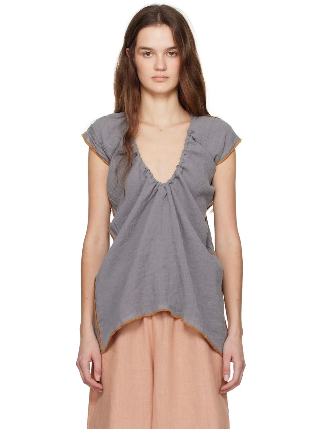 Crinkled linen- and cotton-blend gauze blouse. · OEKO-TEX®-certified · Can be worn front to back · Scoop neck · Self-tie drawstring at shoulders · Exposed side seams · Low back · Contrast stitching in orange Supplier color: Bayon grey/Yellow 74% linen, 26% cotton. Made in Turkey 251922F111007