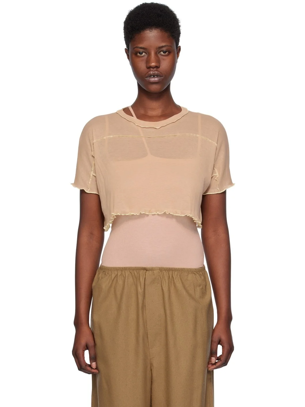 Semi-sheer organic cotton jersey T-shirt. GOTS-, OEKO-TEX®-, and OCS 100-certified. · Paneled cosntruction · Exposed seams throughout · Boat neck · Lettuce edge at cropped hem Supplier color: Rosy camel 100% organic cotton. Made in Portugal 241922F110021