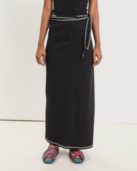 Product Details Ribbed organic cotton jersey wrap skirt Exposed contrast seams Model wears a size S 73% Organic Cotton 24% Recycled Cotton 3% Elastane Made in Portugal Fiber origin – Tanzania/Portugal Spun in Portugal Woven in Portugal Sewn in Portugal