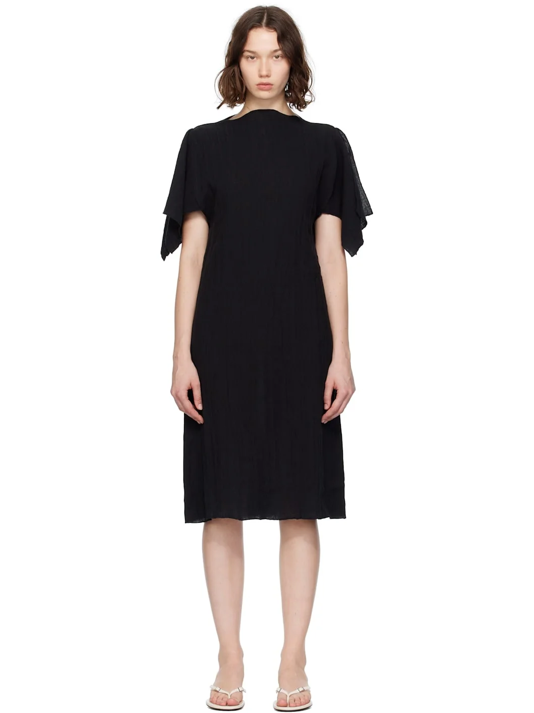 Crinkled linen- and organic cotton-blend gauze midi dress. OEKO-TEX®-certified. · Boatneck · Slit at sleeves Supplier color: Black 74% linen, 26% organic cotton. Made in Turkey 251922F054007