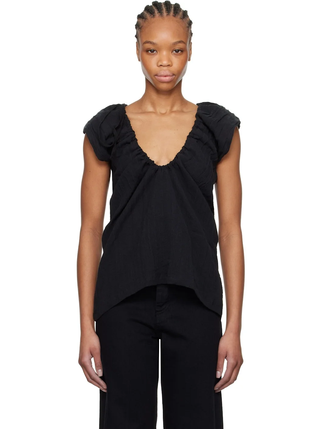 Crinkled linen- and cotton-blend gauze blouse. OEKO-TEX®-certified. · Can be worn front to back · Ruching at scoop neck · Self-tie drawstring at shoulder · Cap sleeves Supplier color: Black 74% linen, 26% cotton. Made in Turkey 251922F111006