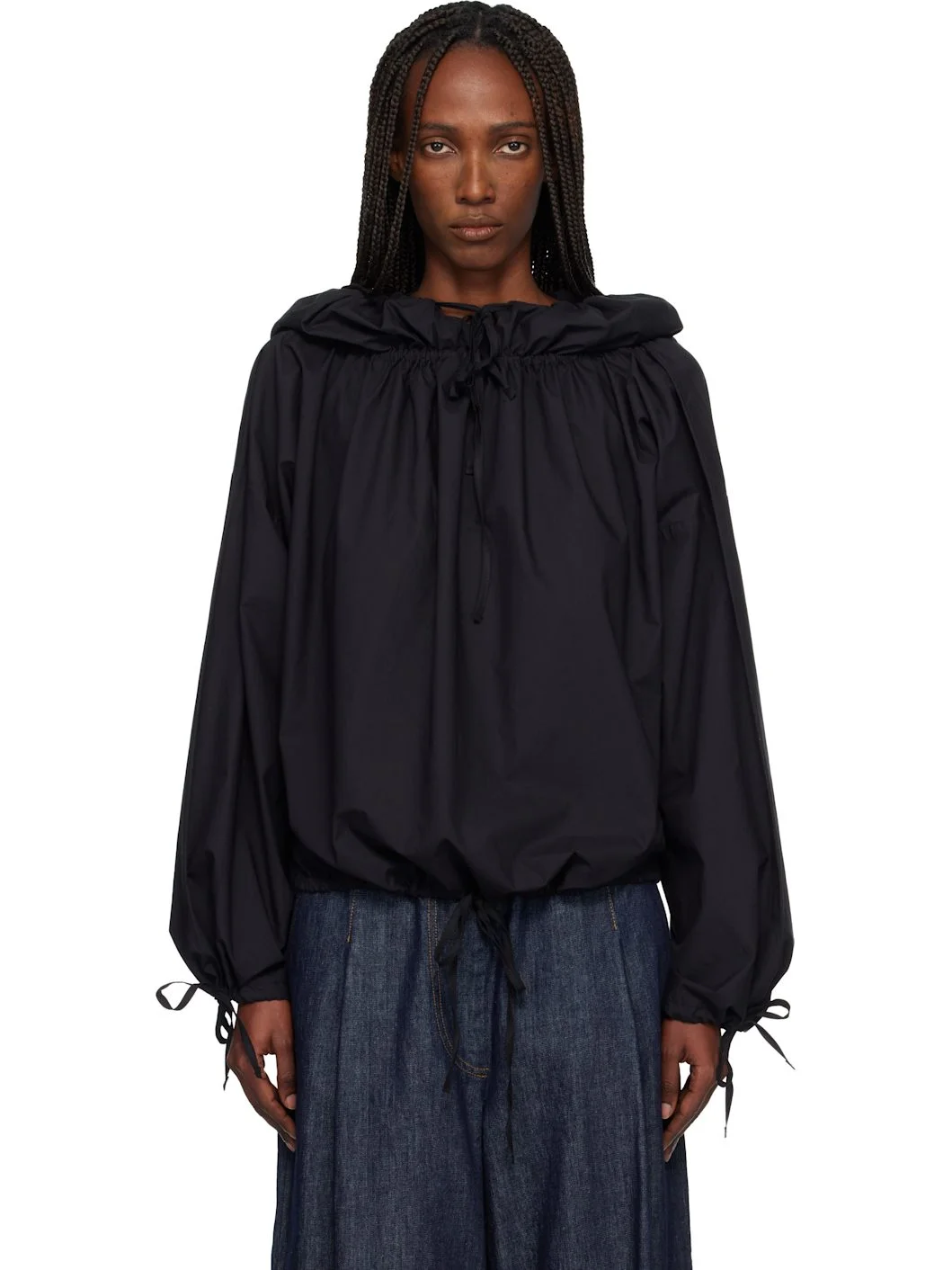 Organic cotton poplin blouse. · Certified GOTS, OCS-100, and OEKO-TEX® · Drawstring at hood, collar, hem, and cuffs · Dropped shoulders · Balloon sleeves Supplier color: Black 100% cotton. Made in Turkey 252922F107000