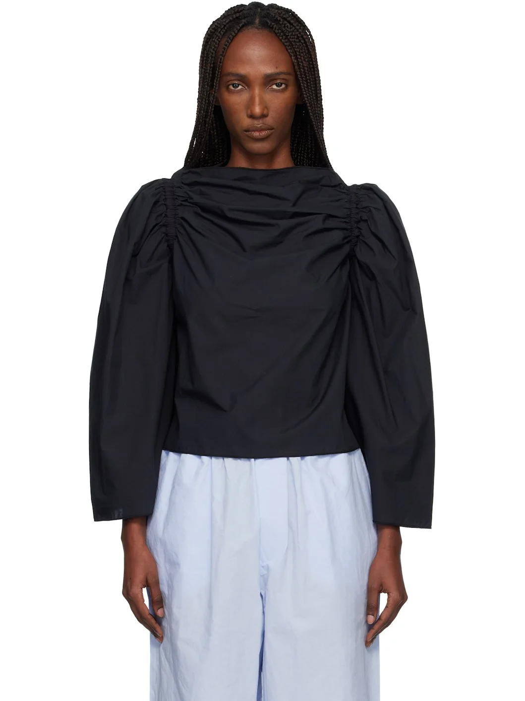 Organic cotton poplin blouse. · Certified GOTS, OCS-100, and OEKO-TEX® · Boatneck · Ruching at elasticized armscyes Supplier color: Black 100% cotton. Made in Turkey 252922F110051