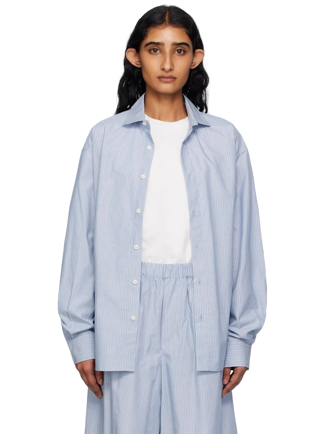 Organic cotton poplin shirt. · Certified GOTS, OEKO-TEX®, and OCS 100 · Striped throughout · Spread collar · Button closure · Shirttail hem · Pleats at buttoned barrel cuffs Supplier color: Blue stripe 100% organic cotton. Made in Portugal 252922F109000
