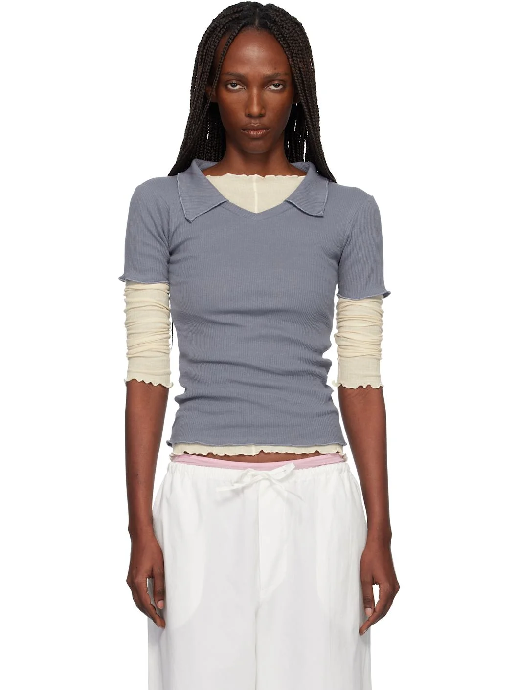 Rib-knit organic- and recycled-cotton T-shirt. · V-neck with spread collar · Lettuce edge at hem and cuffs Supplier color: Light Denim 50% organic cotton, 50% recycled cotton. Made in Portugal 252922F110046