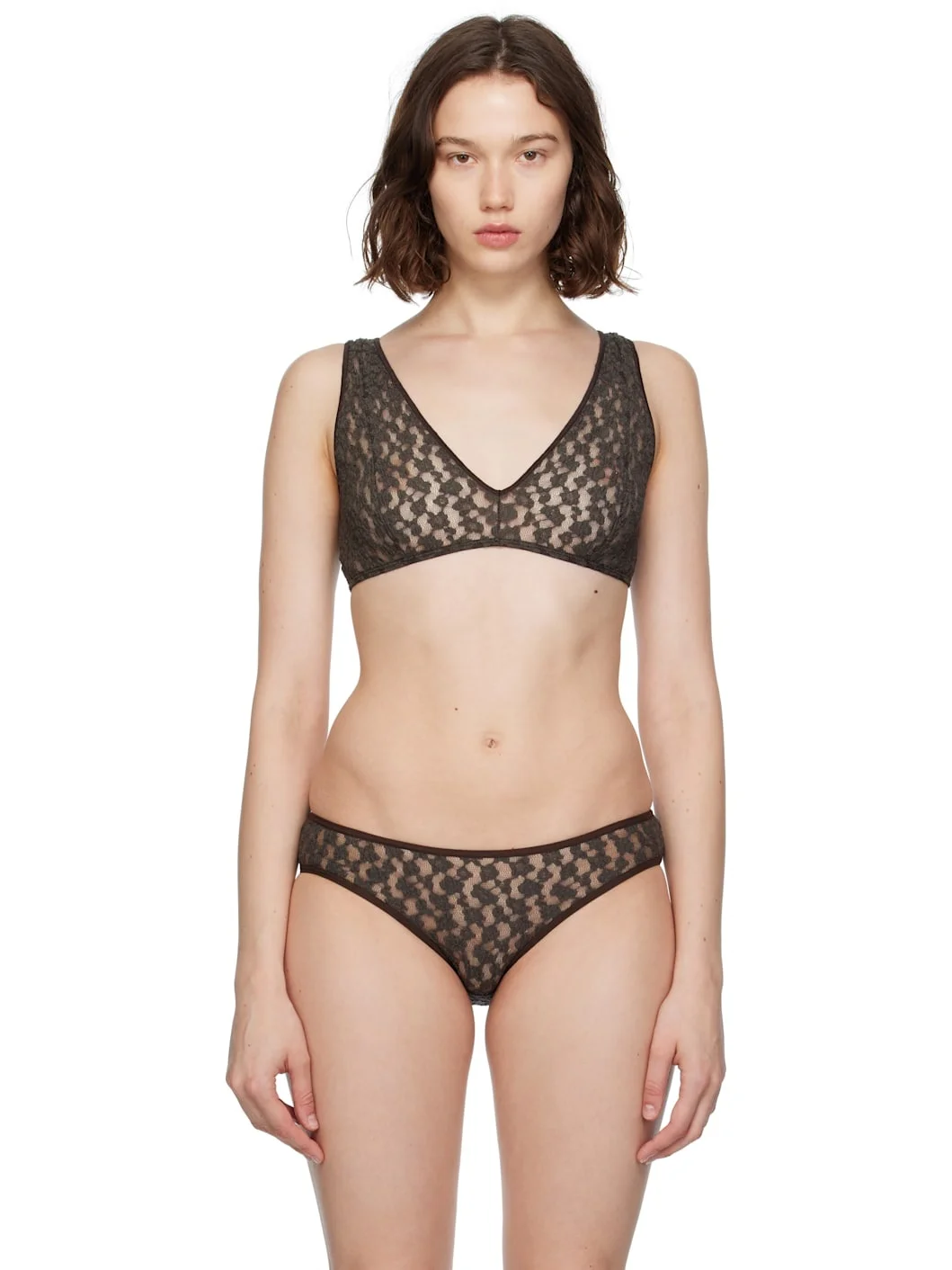 Sheer stretch organic cotton-blend lace bra. · Certified GOTS, OEKO-TEX®, and OCS 100 · Jacquard floral pattern throughout · V-neck · Fixed shoulder straps Supplier color: Black/Brown 46% organic cotton, 52% polyamide, 2% elastane. Made in Portugal 251922F073014
