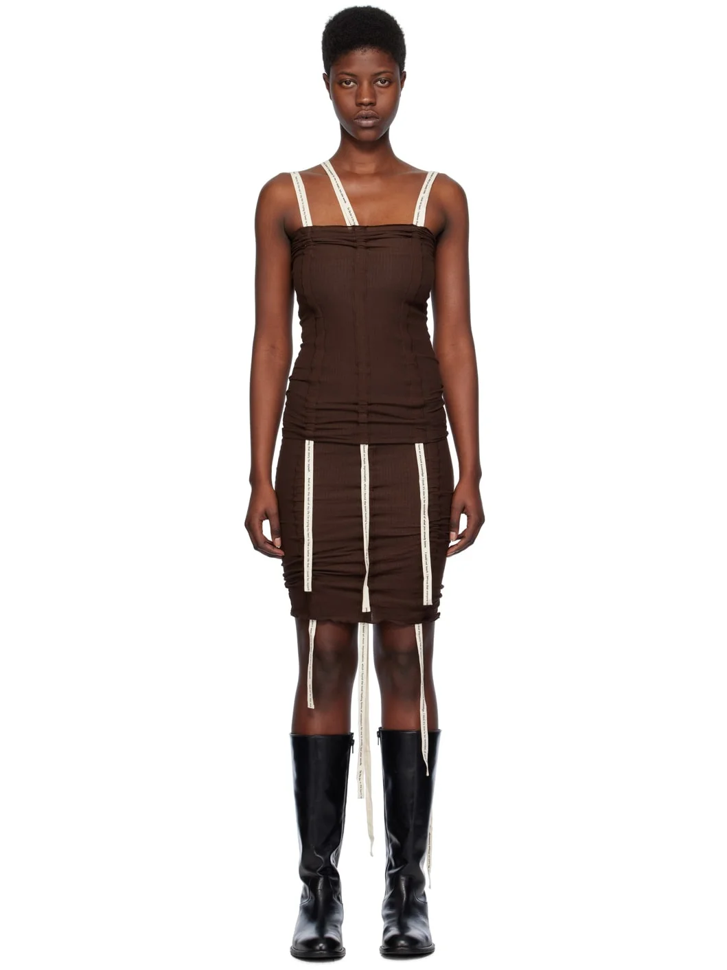 Ribbed stretch organic cotton jersey tank top. GOTS-, OEKO-TEX®-, and OCS 100-certified. · Cinch straps and ruching throughout · Text printed at cinch straps · Straight neck · Extended trim at hem · Adjustable shoulder straps Supplier color: Tactile 91% organic cotton, 9% elastane. Made in Portugal 241922F111003