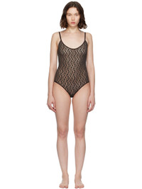 Sheer stretch organic cotton-blend lace bodysuit. · Certified GOTS, OEKO-TEX®, and OCS 100 · Jacquard floral pattern throughout · Scoop neck · Adjustable elasticized shoulder straps · Press-stud fastening at bottom · Low back Supplier color: Black/Brown 46% organic cotton, 52% polyamide, 2% elastane. Made in Portugal 251922F358004