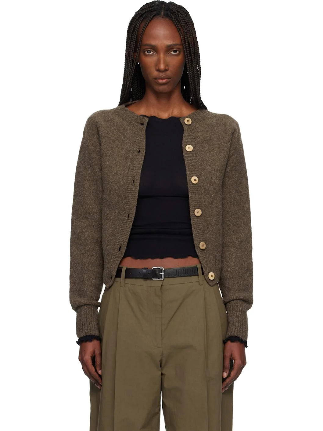 Knit merino wool cardigan. · Rib-knit round neck, hem, and cuffs · Button closure · Dropped shoulders Supplier color: Burel Brown 100% merino wool. Made in France 252922F095004